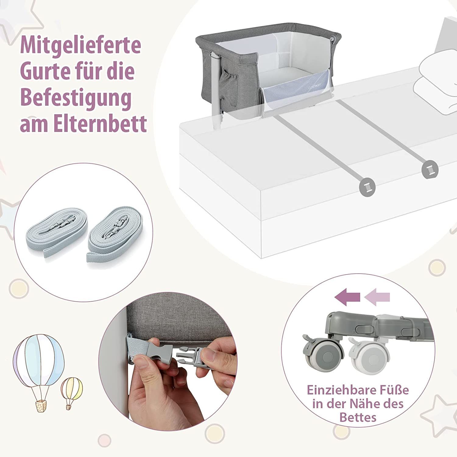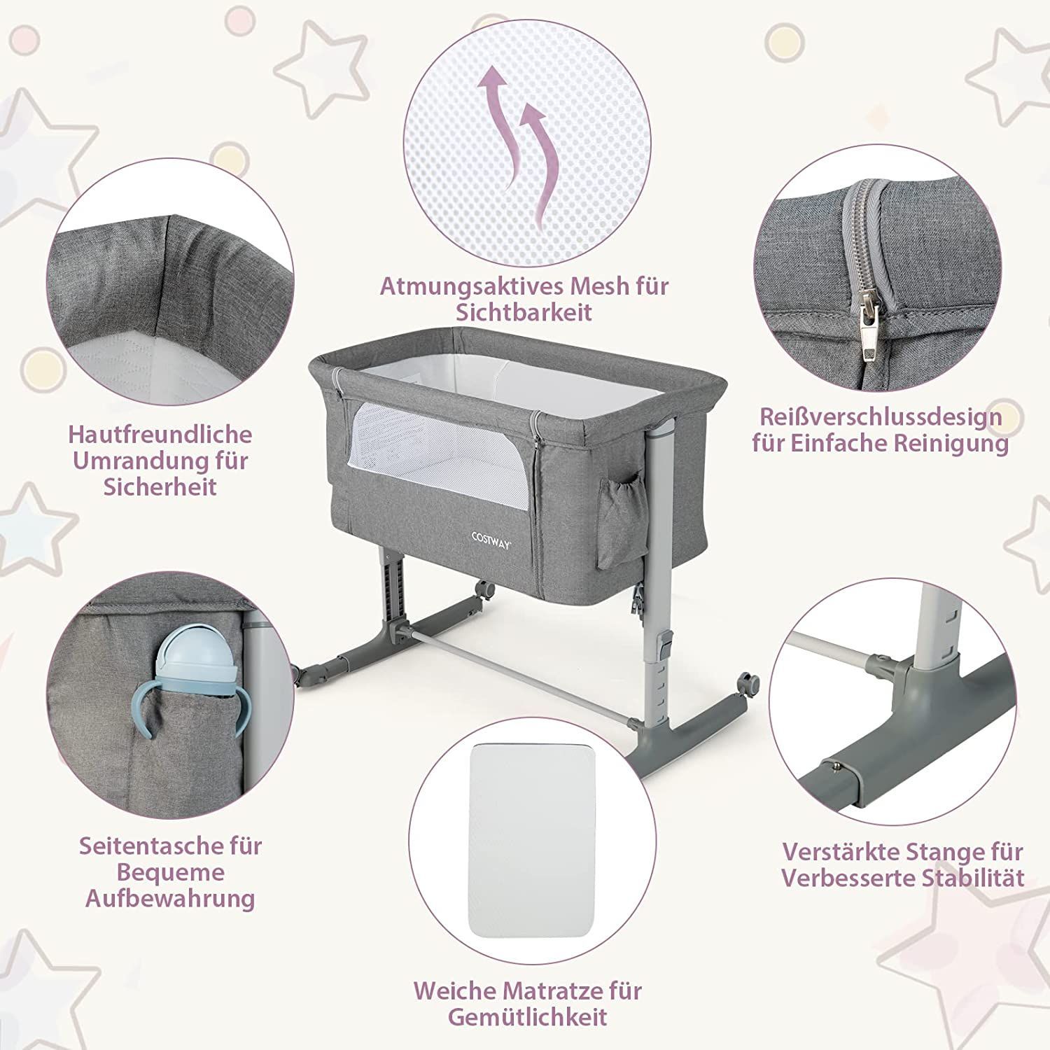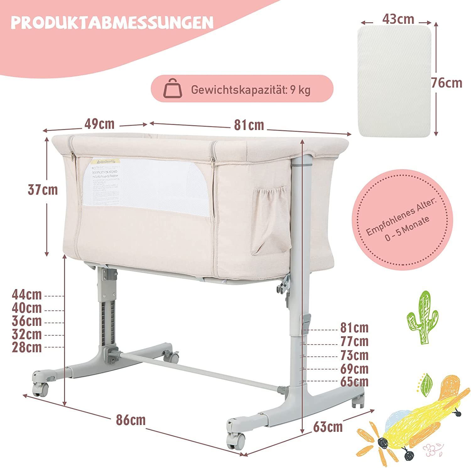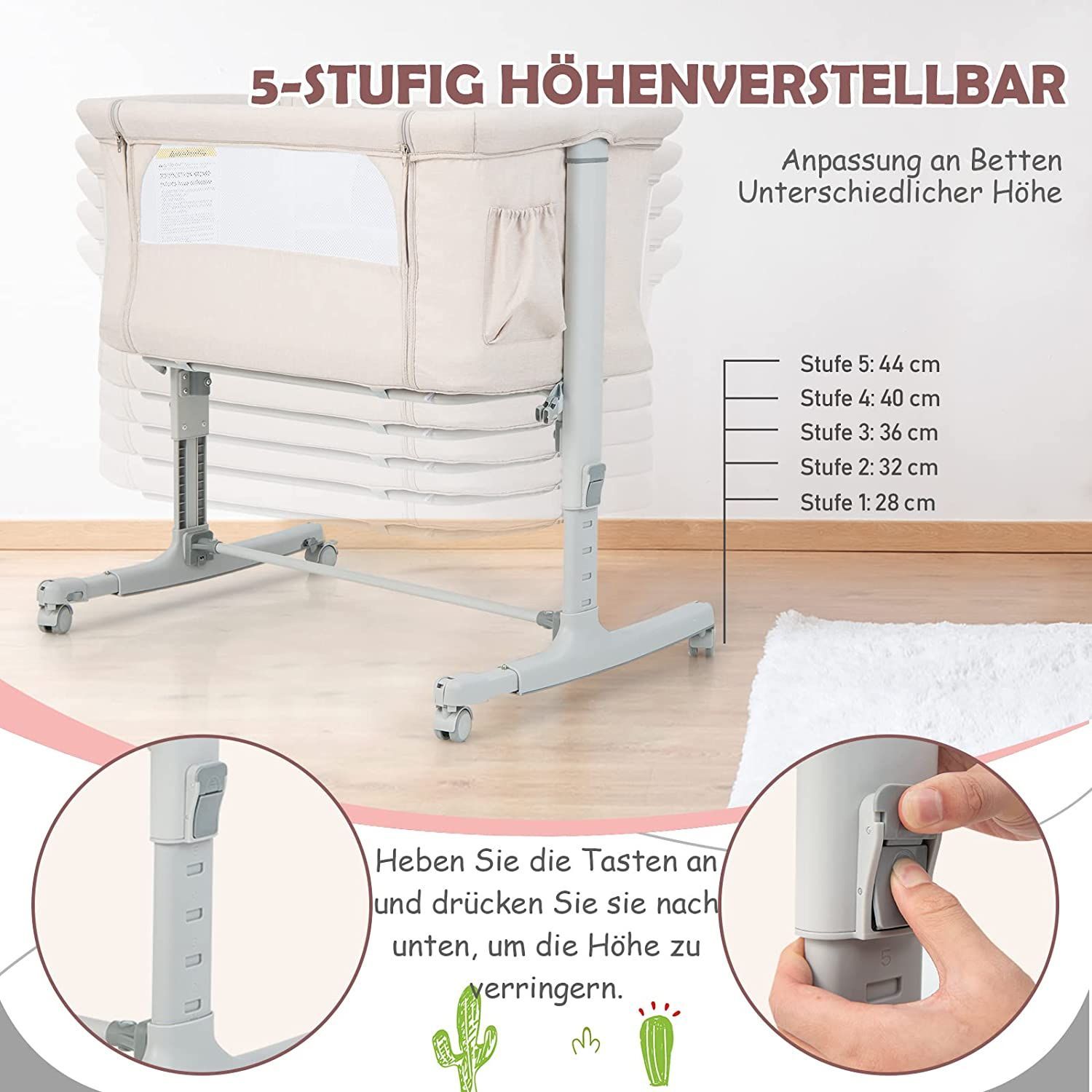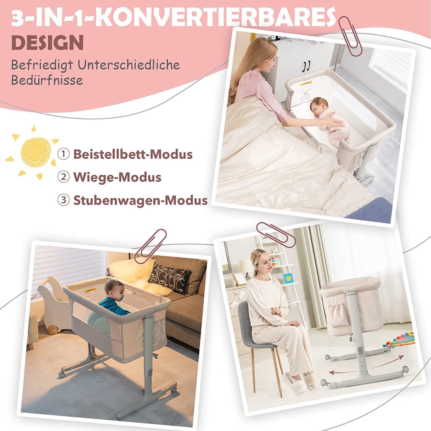 3 in 1 Beistellbett & Babywiege & Reisebett, 5-stufig Höhenverstellbares Babybett