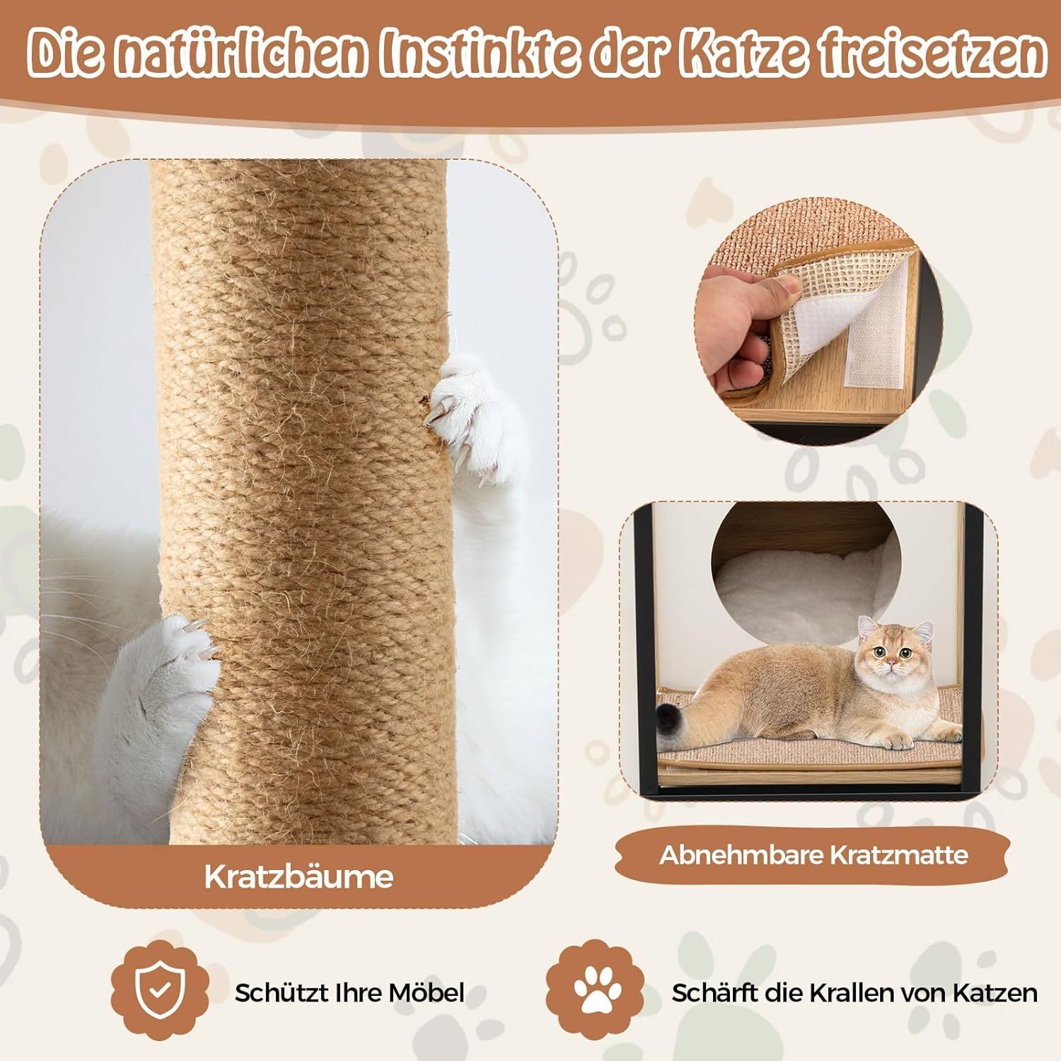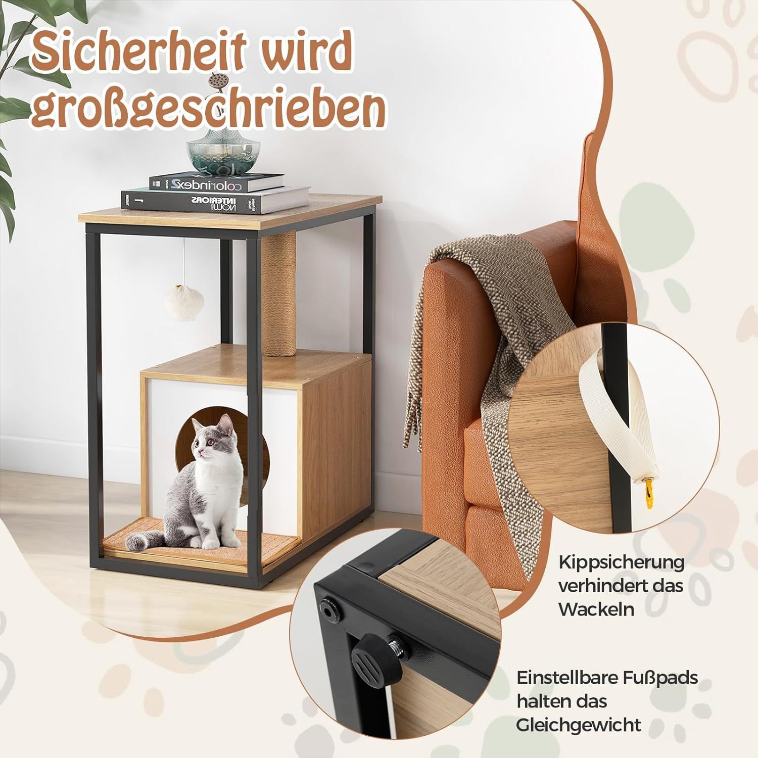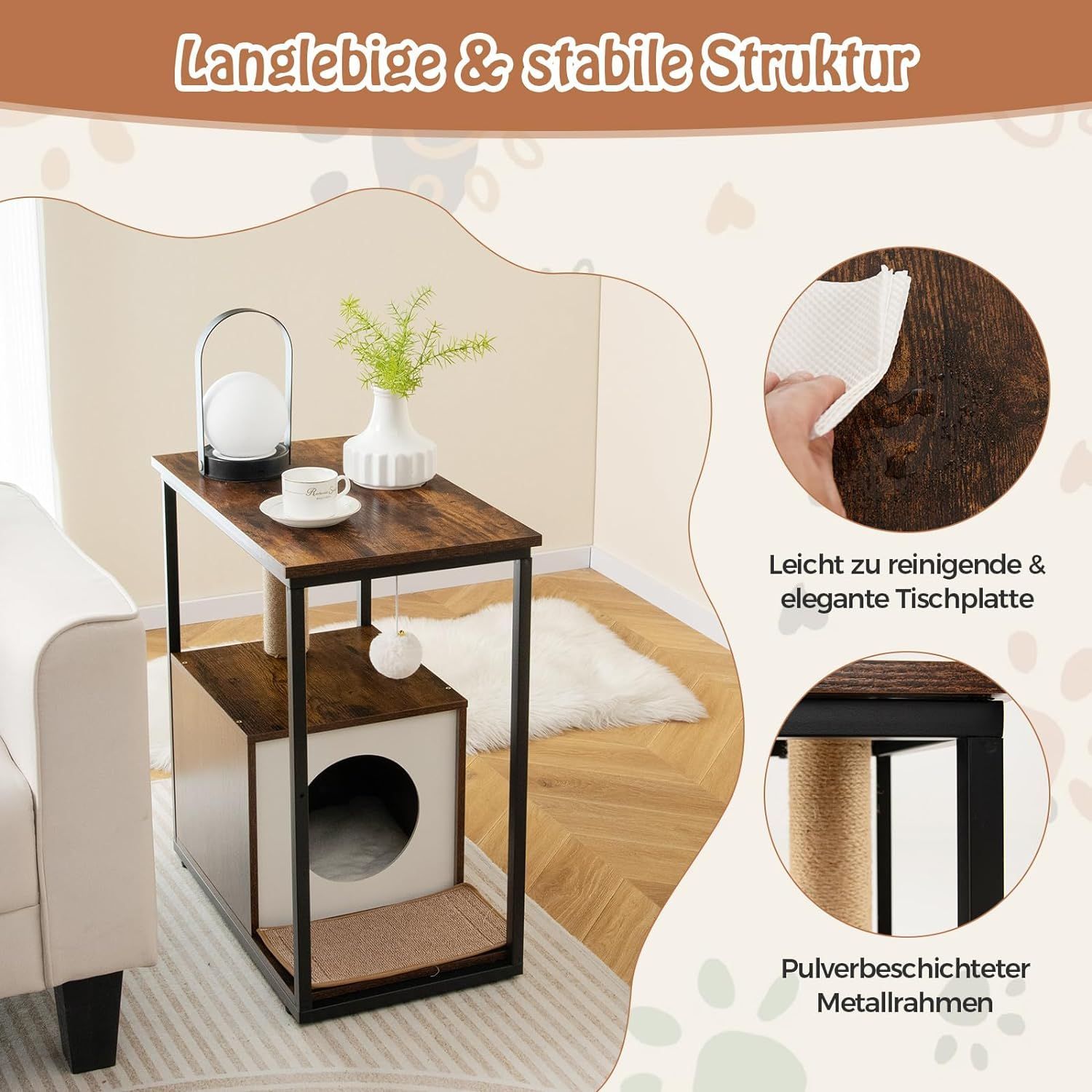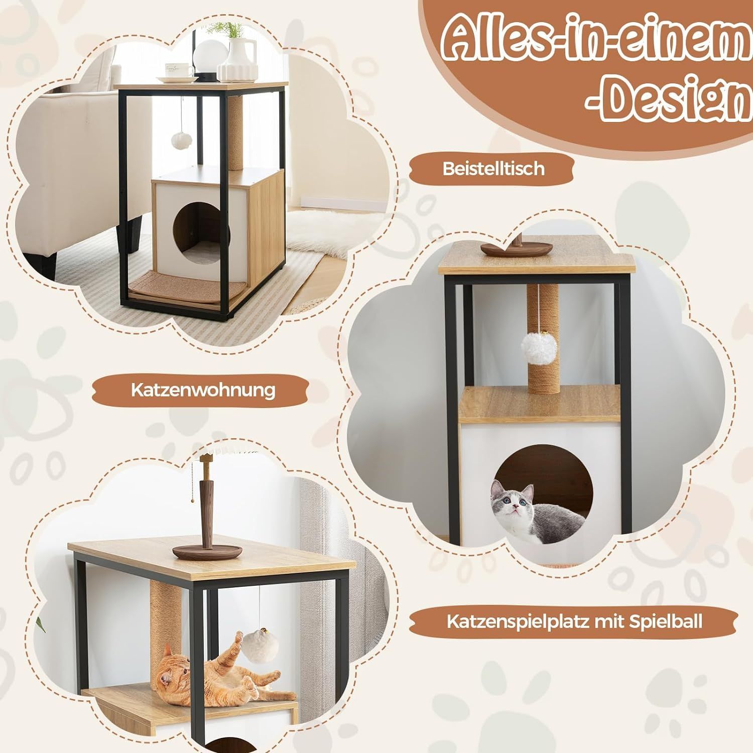 3 in 1 Katzenhaus & Kratzbaum & Beistelltisch, Katzenhöhle mit Abnehmbarer Kratzmatte