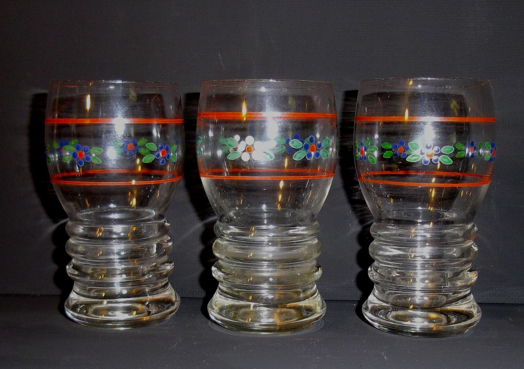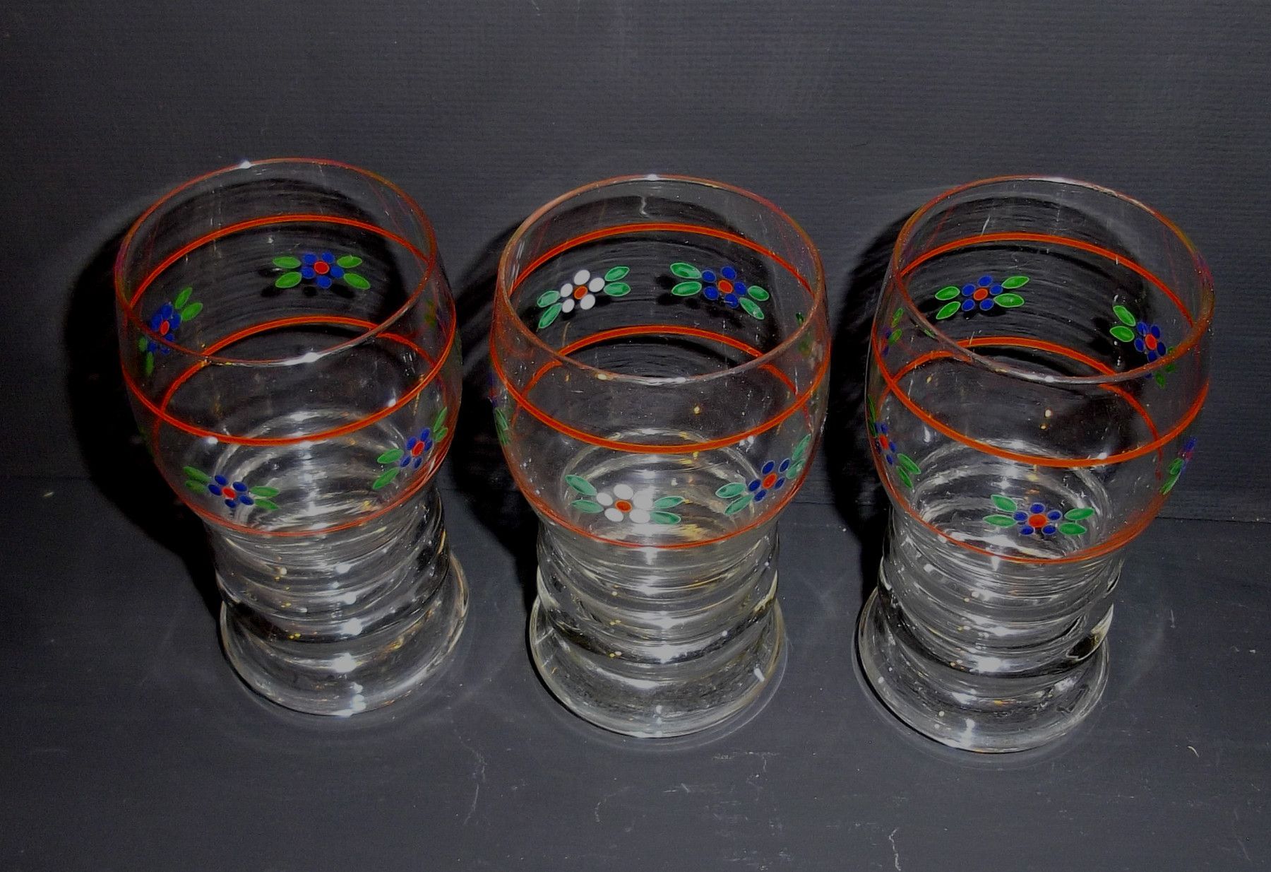 Drei kleine Weingläser um 1920. Ausgefallene Form. Handbemalt. Maße: Höhe 9 cm. Antikes am Deich - Inh: Oliver Kipp-Trense