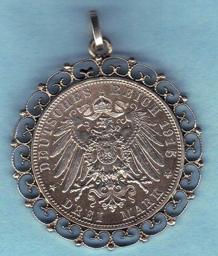 Originalmünze Land Epoche: Sachsen Weimar Eisenach Nominal: 3 Mark Jahr: 1915 Prägestätte: D Motiv: Georg II. Material: 900 000 Silber Gesamt)gewicht: 20,4 Gramm mit Anhängerahmen Durchmesser: 33 mm Erhaltung: prägefrisch