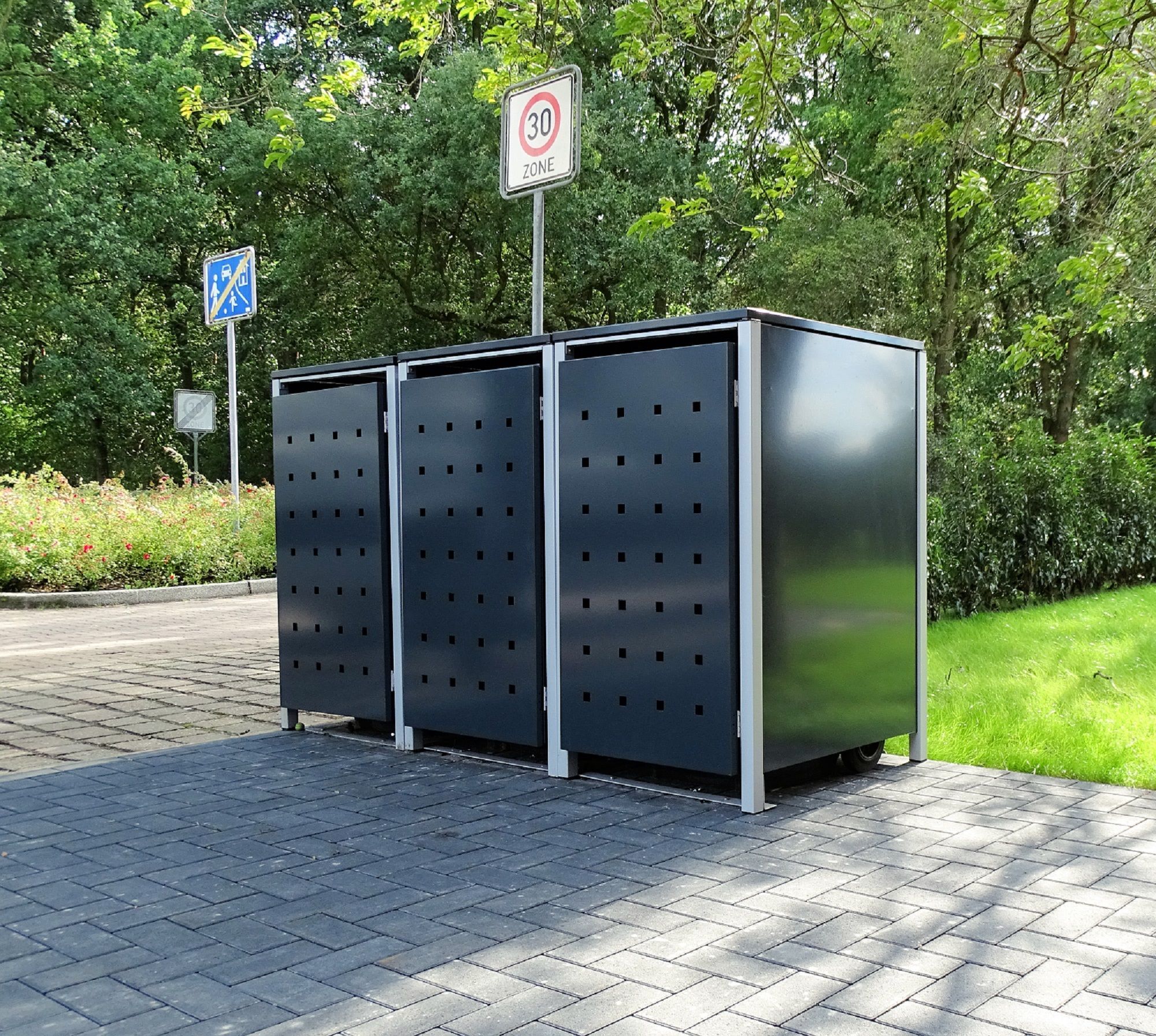 3 Mülltonnenboxen Modell No.2 Anthrazitgrau für 240 Liter Mülltonnen / witterungsbeständig durch Pulverbeschichtung / mit Klappdeckel und Fronttür