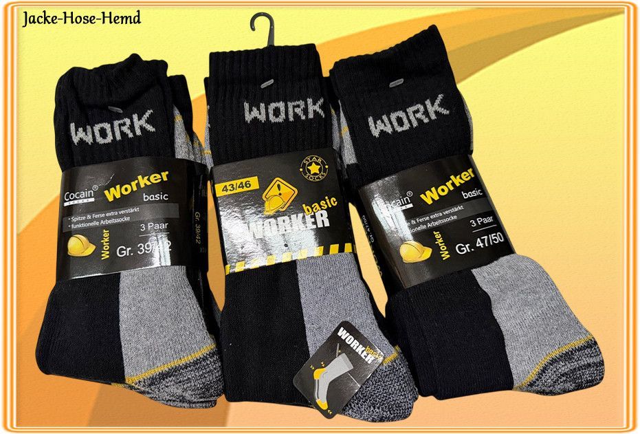 3 Paar Herren Arbeitssocken Produktbeschreibung: 3 Paar Arbeits-Socken, Ferse und Spitze sind verstärkt, Größe: 39 bis 50 Die Arbeits-Socks sind robuste und bequeme Socken im klassischen Stil und eignen sich ideal für den täglichen Einsatz. Sie bestehen aus einem strapazierfähigen, dicht gestrickten