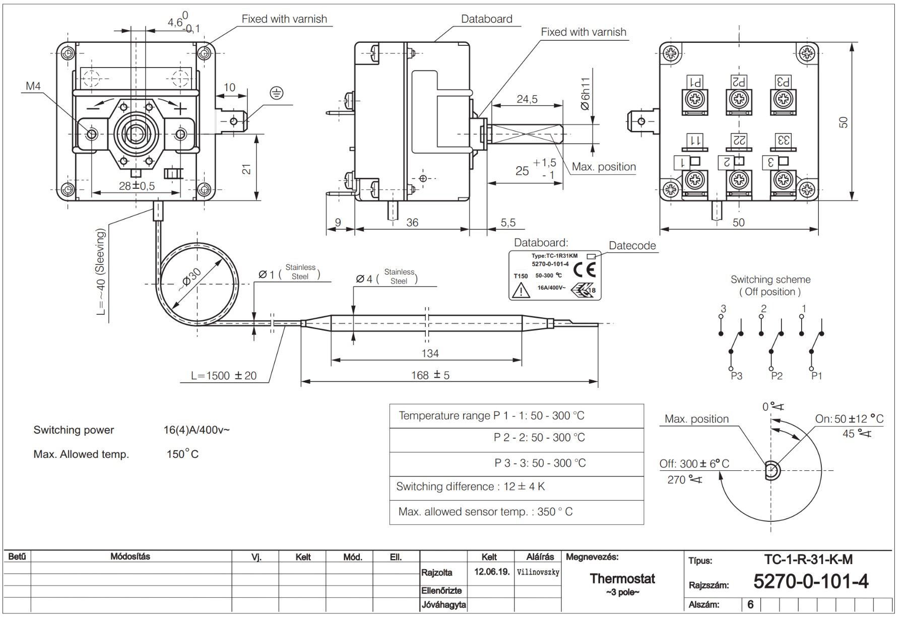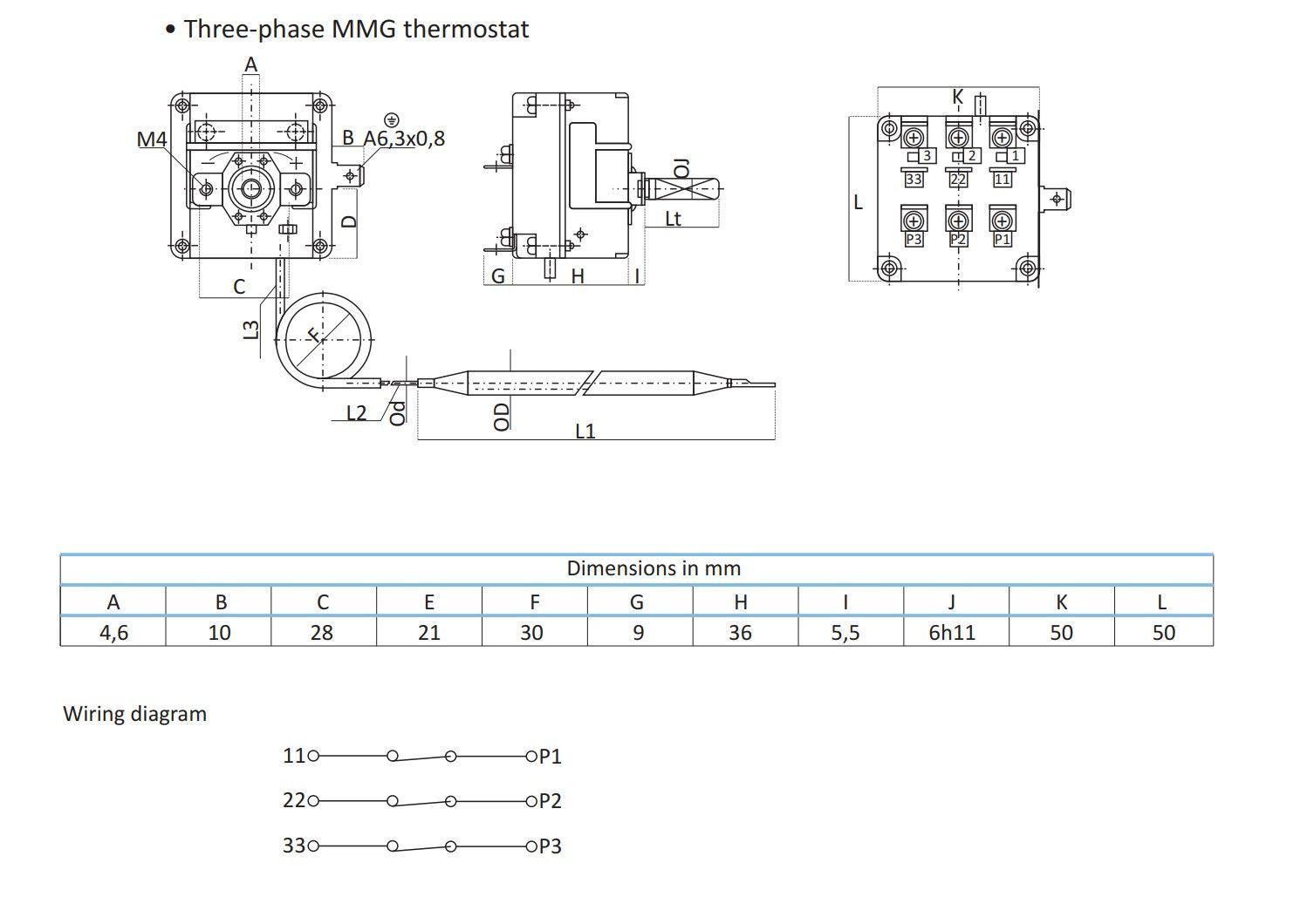 3-Phasen-Abschaltkontakt Kapillarmaterial: Edelstahl mit PVC-Schutz Sensormaterial: Edelstahl Technische Parameter Temperaturbereich: 50-300°C Kontaktbelastung: 16A 400V Schaltdifferenz: 10°C Maximale Sensortemperatur: 320°C Kapillarlänge: 1500 mm Kontaktbelastung: 16(4)A 250V; 6(1)A 400V Spezifikat