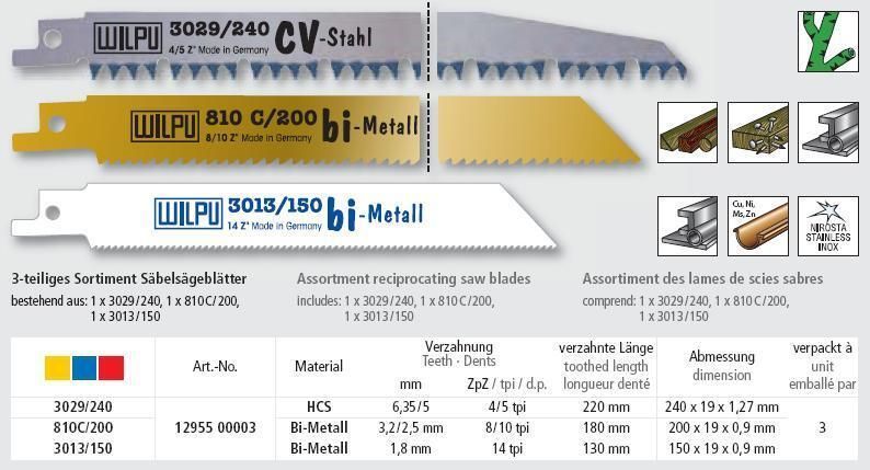 Verteiler: Unser Shop Dieses Angebot umfasst: WILPU Sortiment 3 Sägeblätter für Säbelsägen Der Preis gilt für eine Verpackungseinheit, also 3 Stück für Holz, Stahl Buntmetall und Edelstahl Im Einzelnen: 1 x 3029 240 für Holz Grünholz Zähne geschränkt, geschliffen, schräg geschärft und induktiv gehär