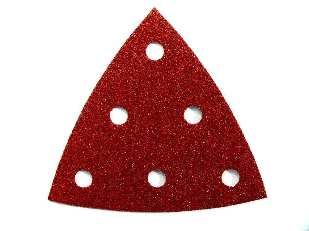 zum Verkauf stehen 3 Schleifblätter 94x94x94 für Dreieckschleifer - Lieferumfang: 3 Stück - Körnung oben wählbar - Größe: 94x94x94 gerade gemessen, über Rundung gemessen 96x96x96 - mit 6 Absauglöchern, Anordung siehe Loch, für Festool - Schleifmittel Korund - Trägermaterial: E-Papier - Bindung: Kuns