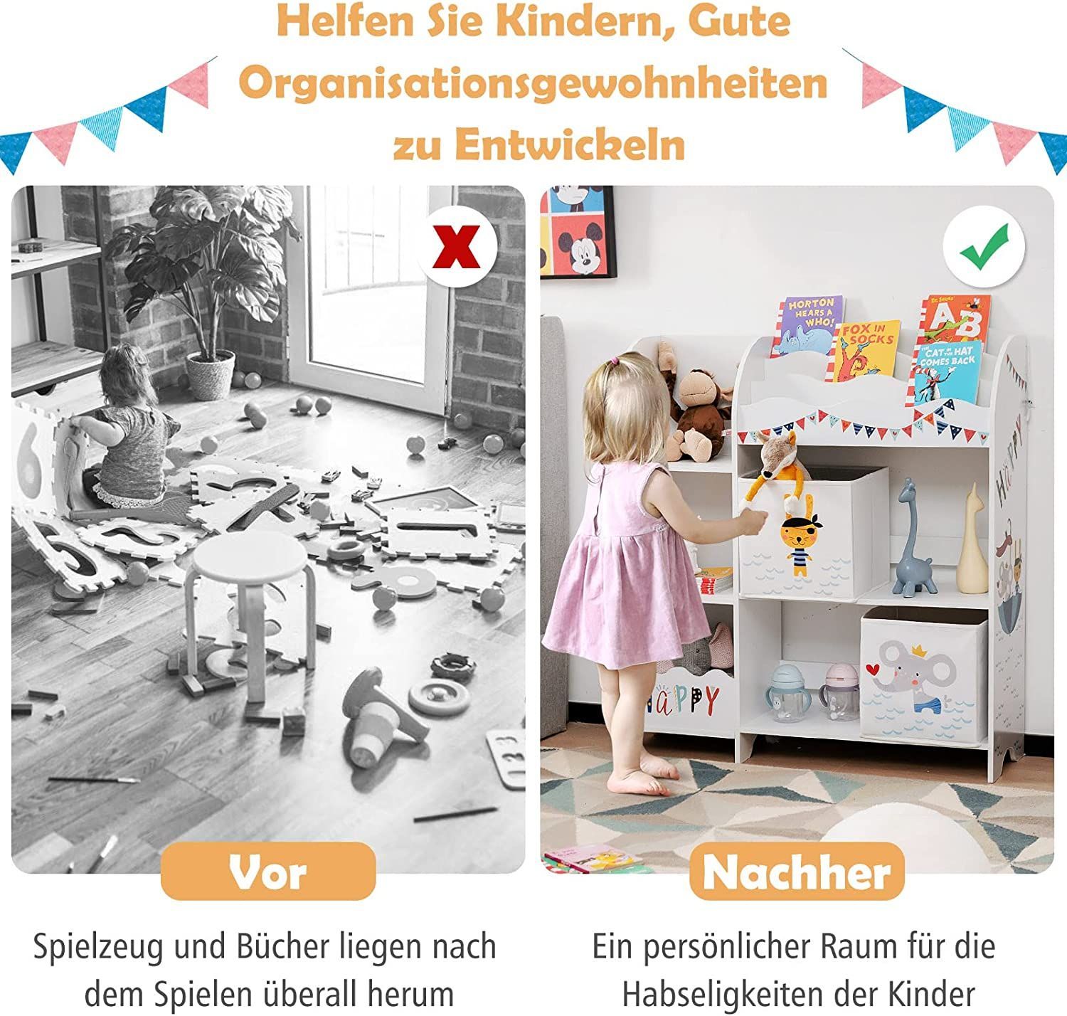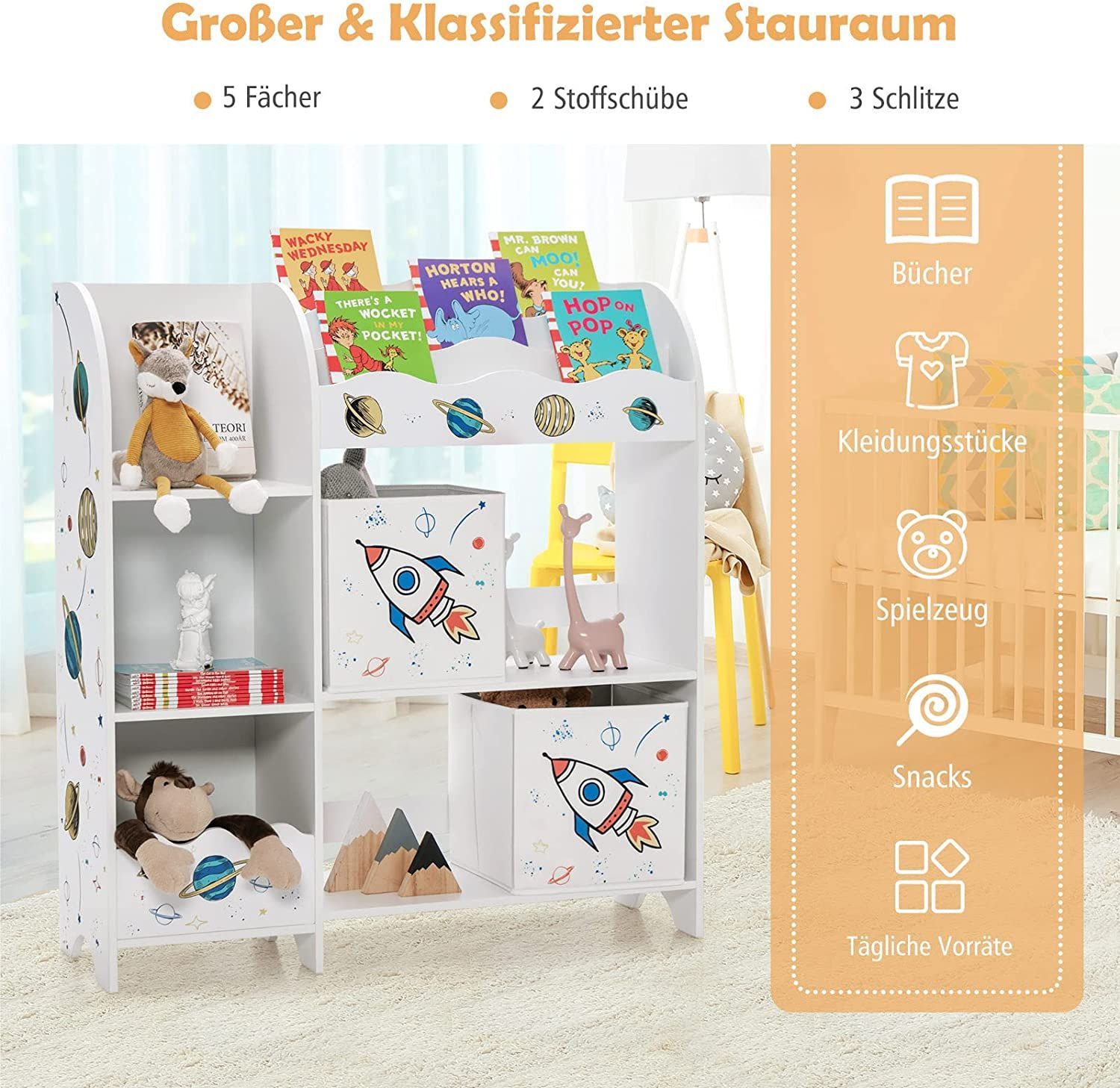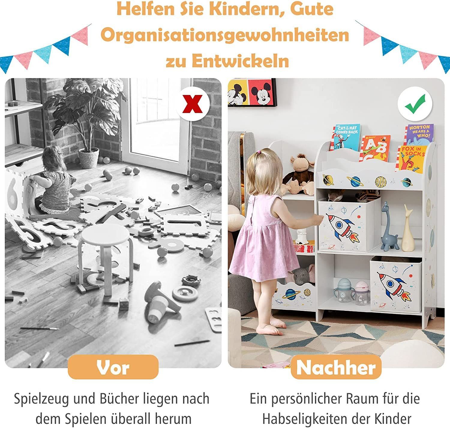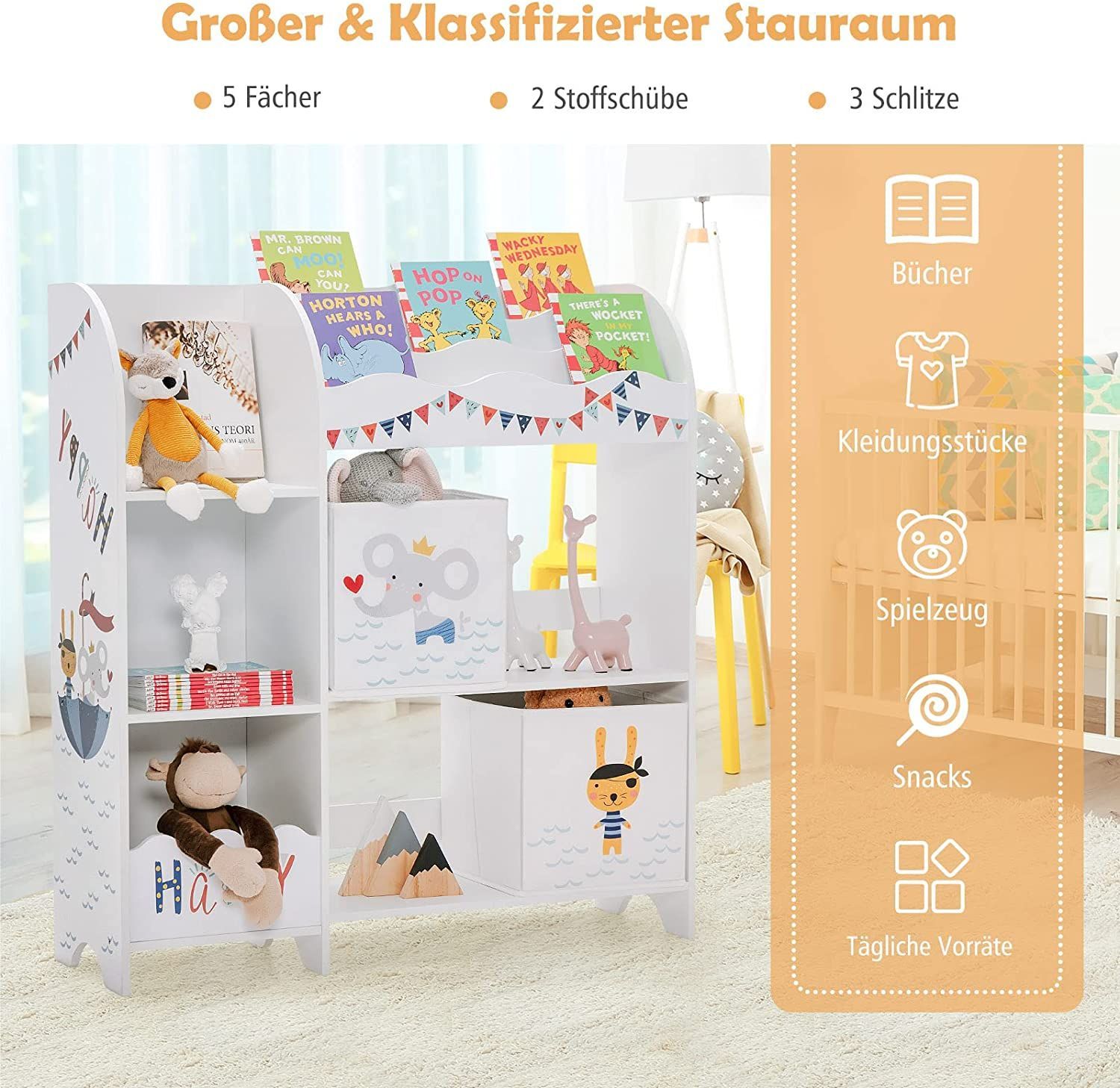 3-stöckiger Kinderregal, freistehender Kinderzimmerregal mit 5 Fächern & 2 boxen