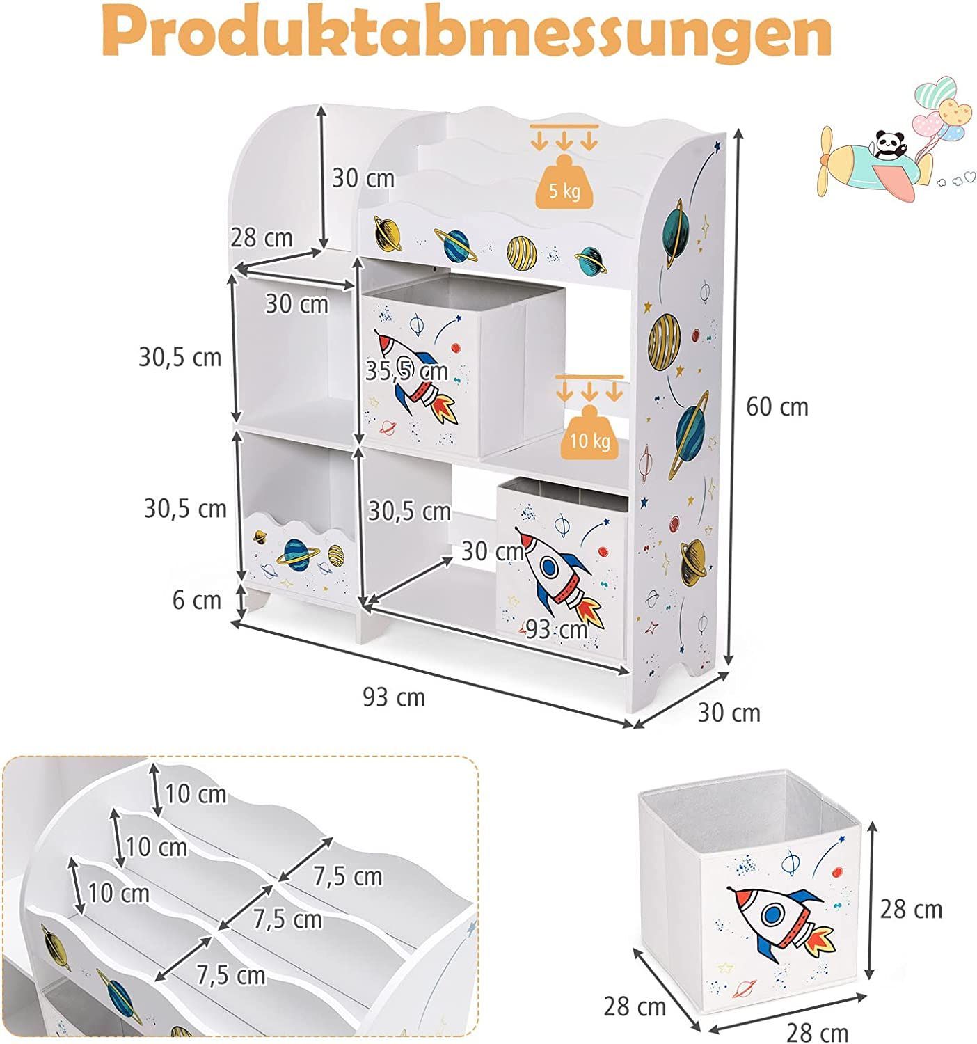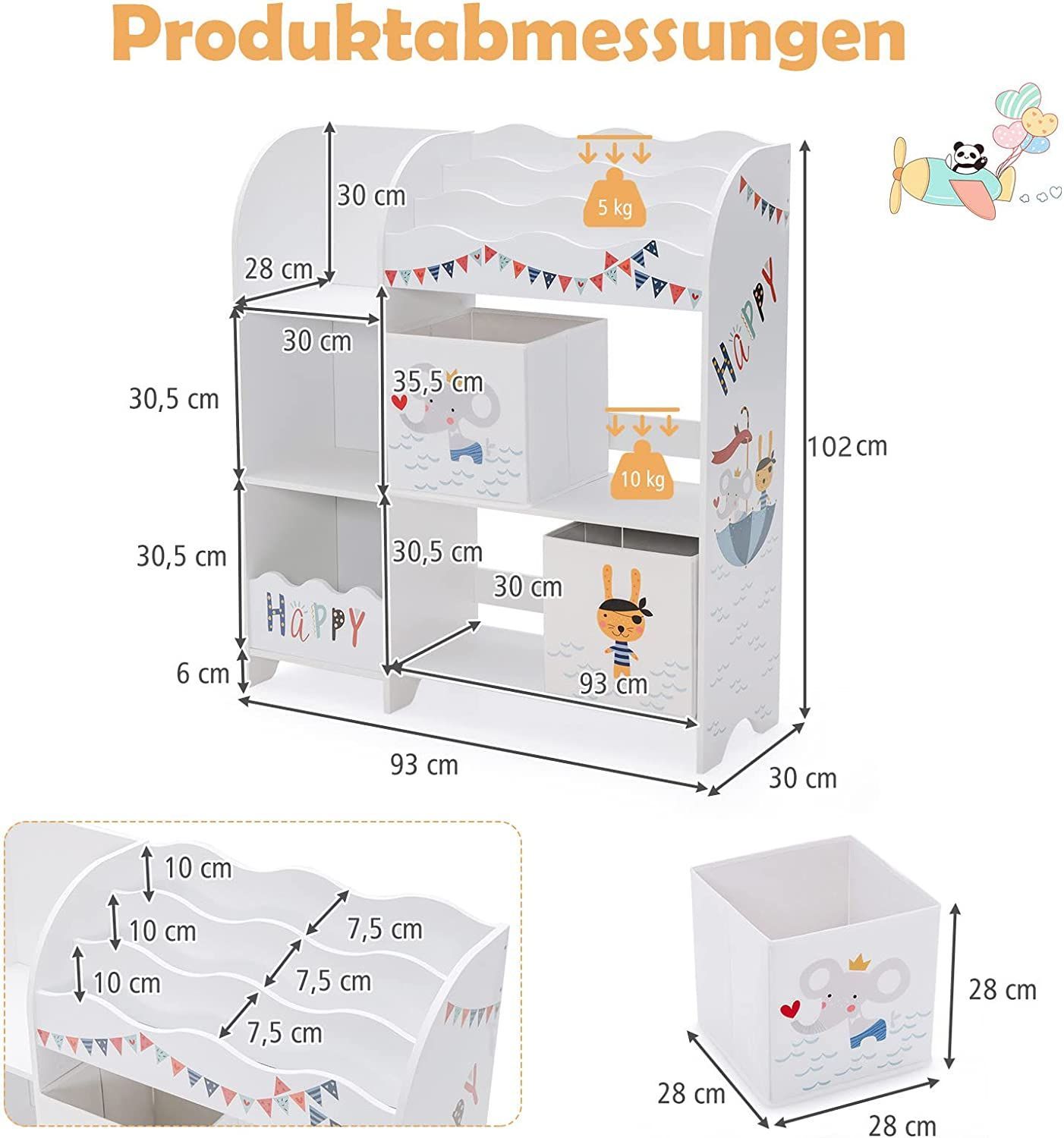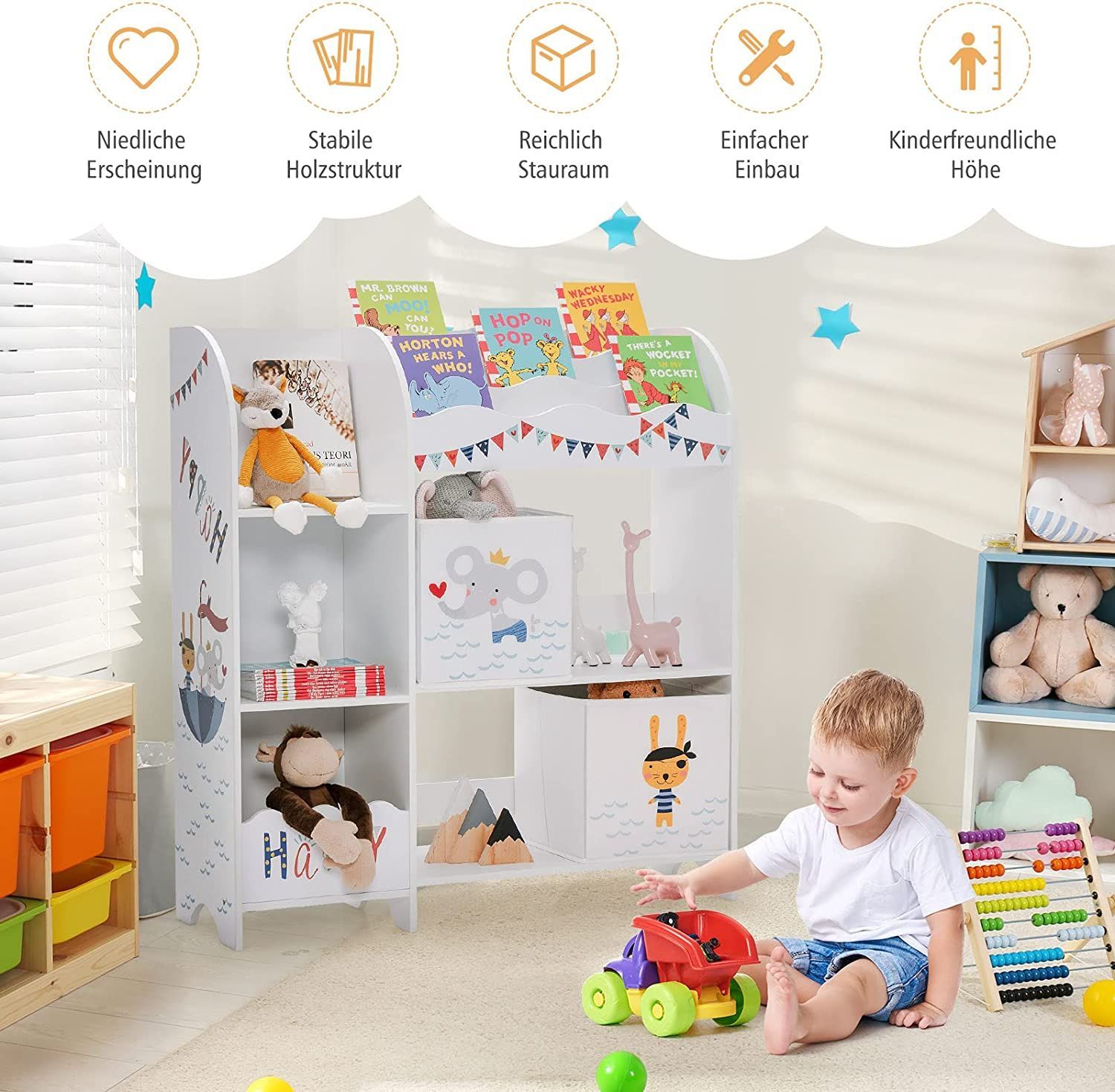 3-stöckiger Kinderregal, freistehender Kinderzimmerregal mit 5 Fächern & 2 boxen