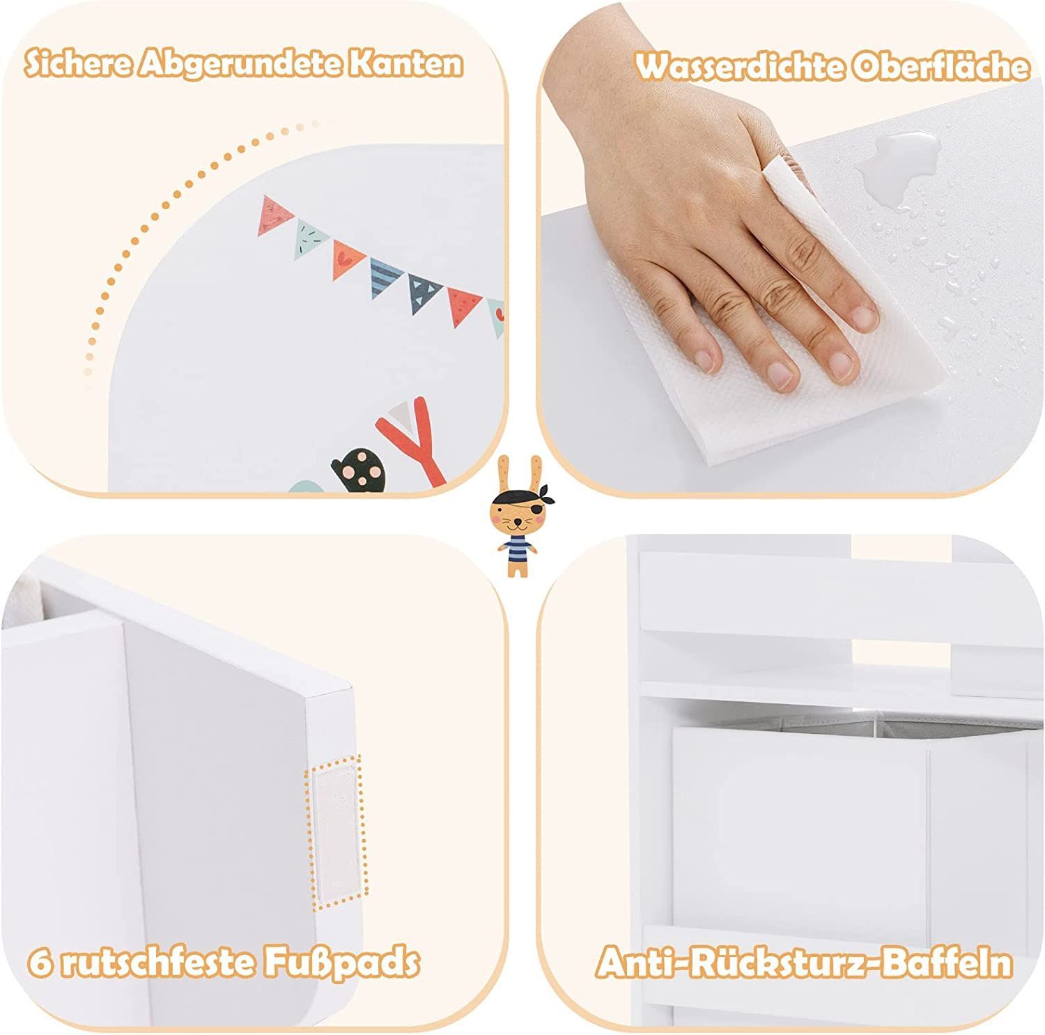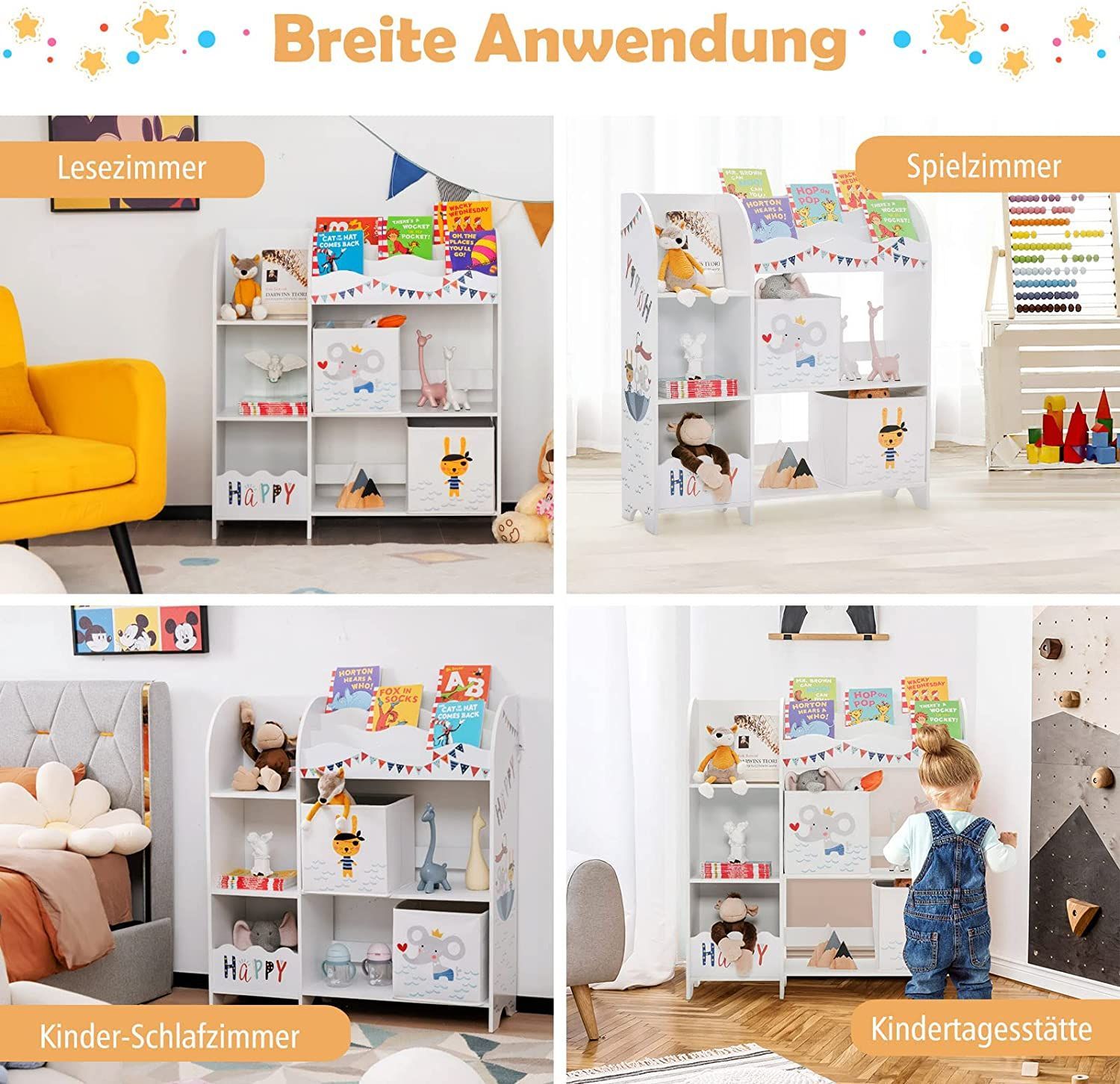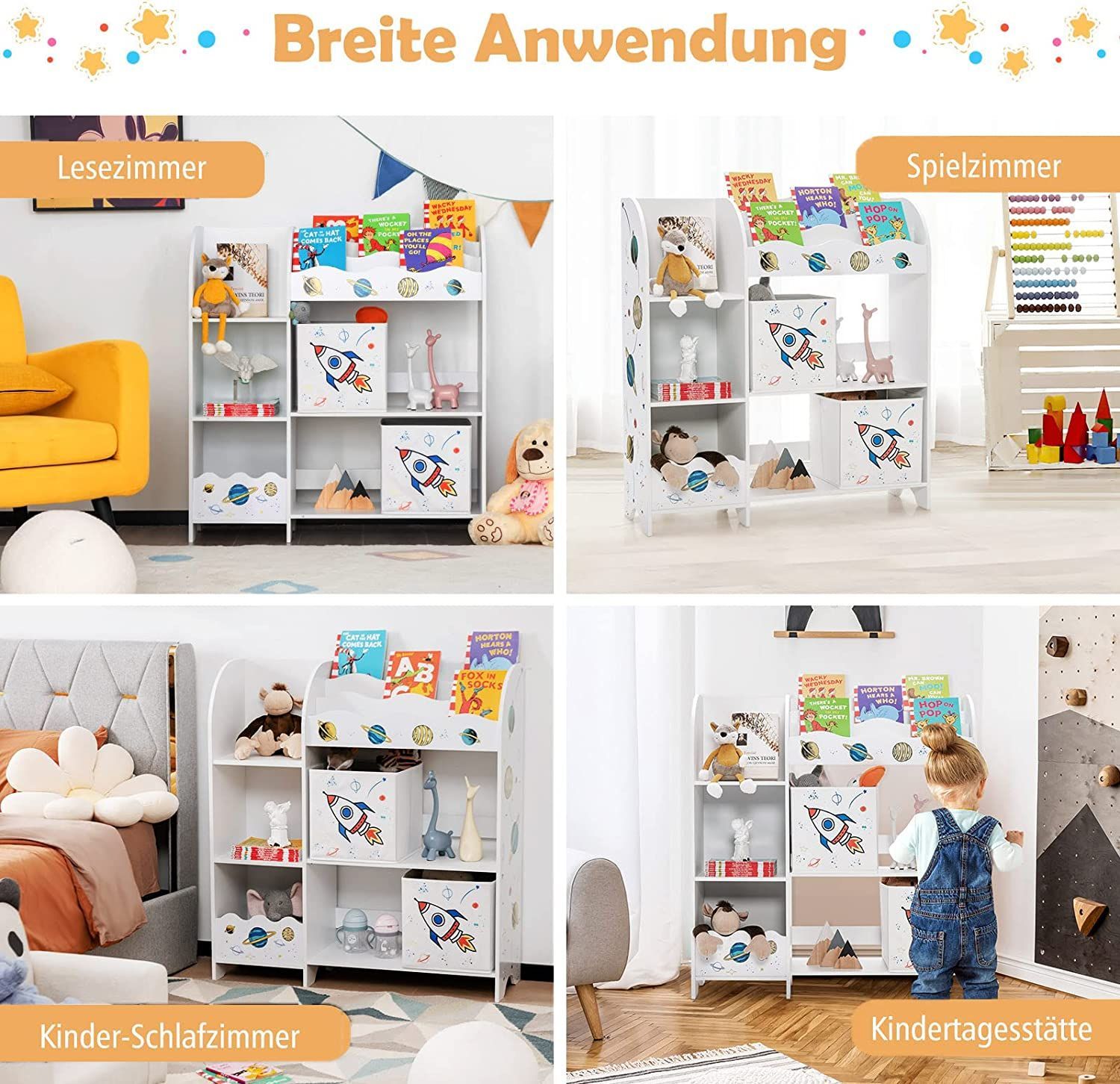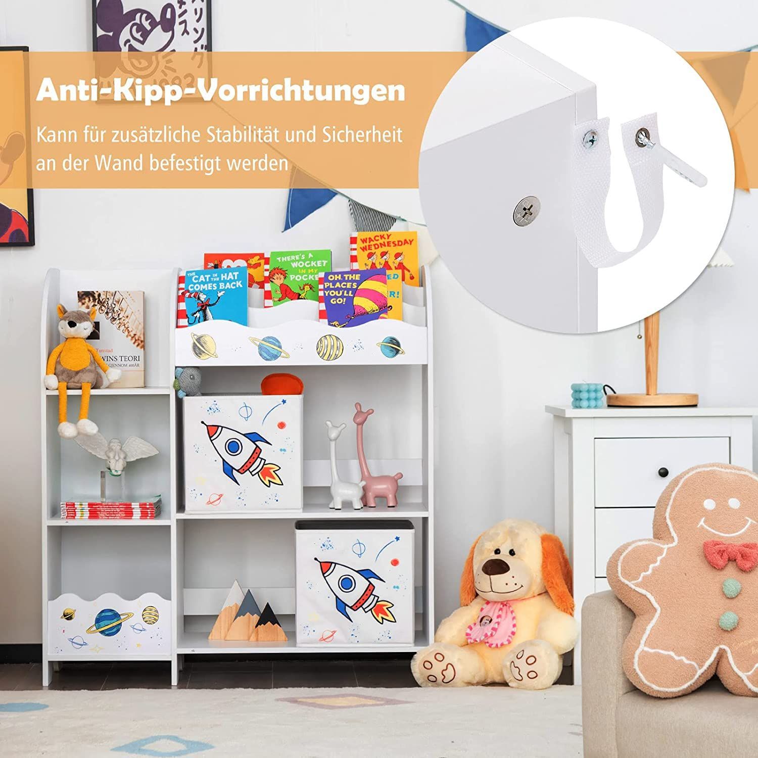 3-stöckiger Kinderregal, freistehender Kinderzimmerregal mit 5 Fächern & 2 boxen