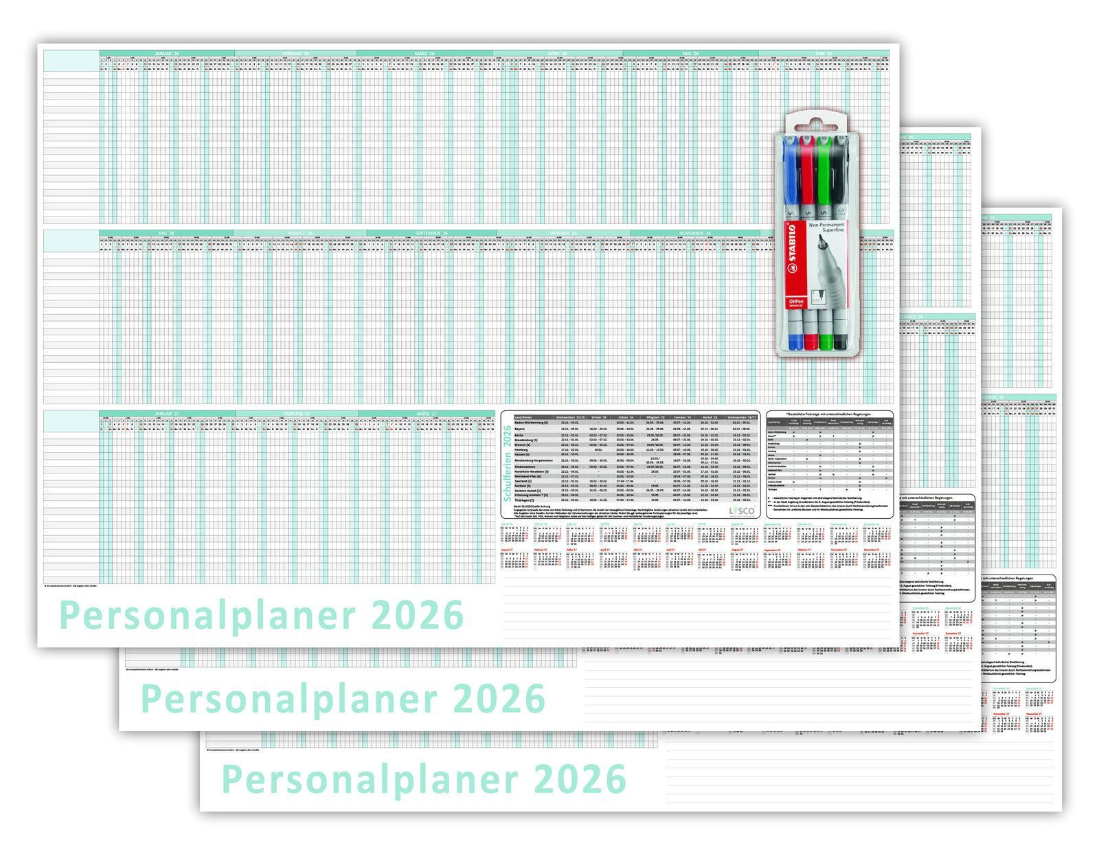 3 Stück Urlaubsplaner DIN B2 2026 nass abwischbar Personalplaner 70x50 Stifteset