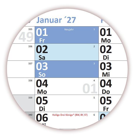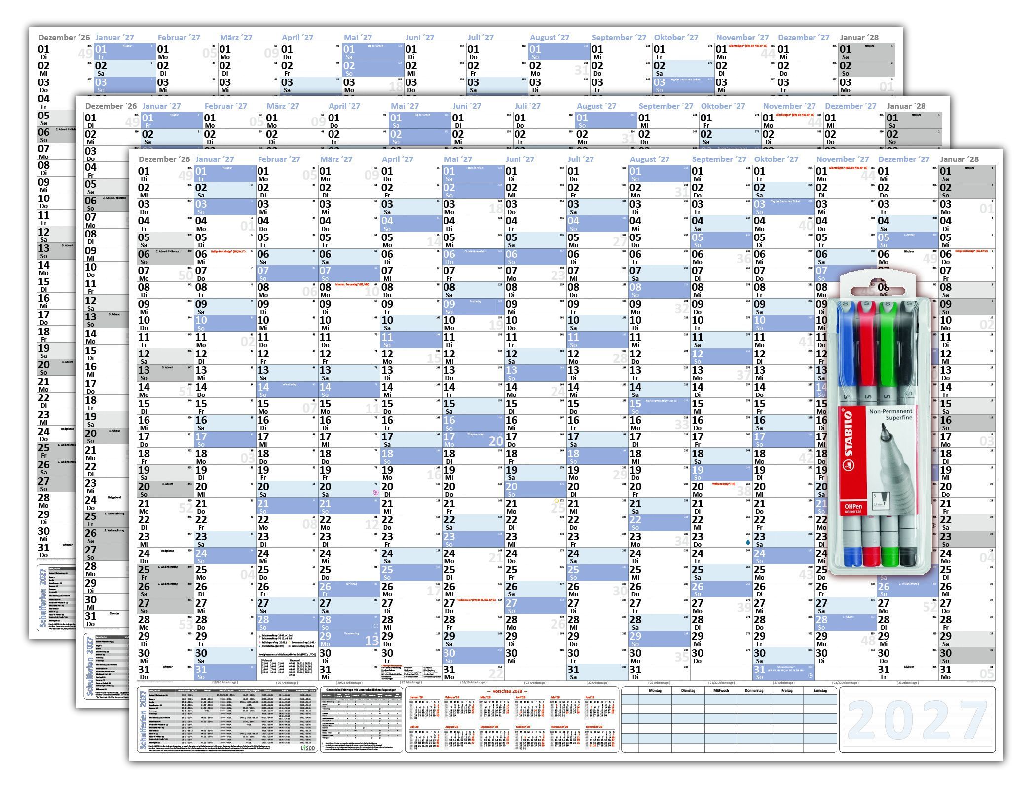3 Stück XXL Wandkalender DIN B1 2027 (100 x 70cm) nass abwischbar inkl. Stifteset