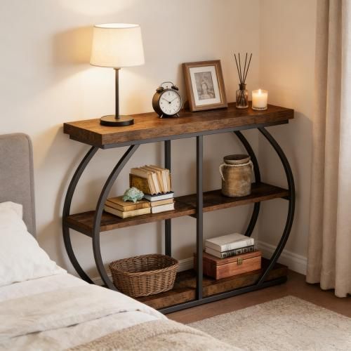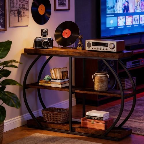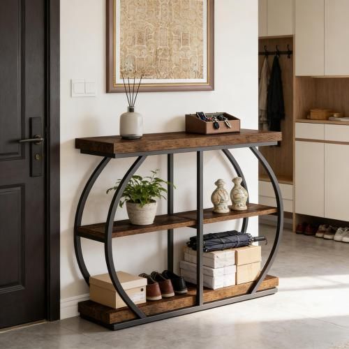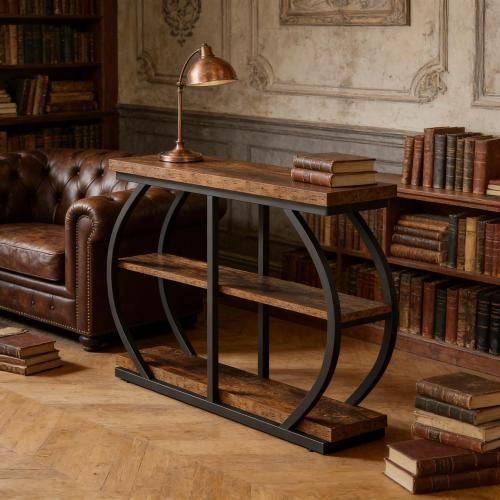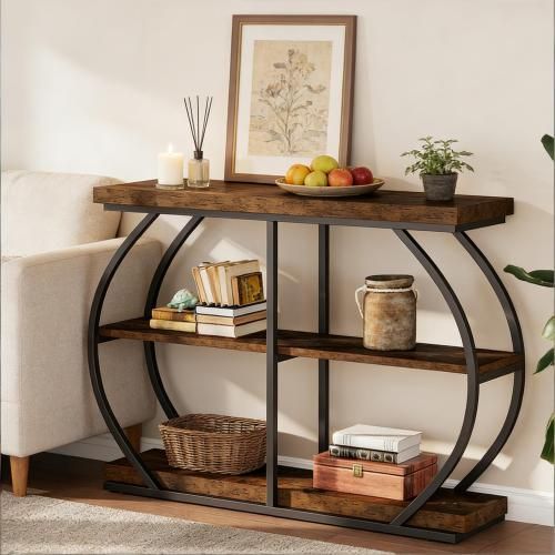 Brauner 3-stufiger Konsolentisch aus Metall und Holz. Ideal als Sofa-, Eingangs- oder Flurtisch mit großem Stauraum und stabiler Konstruktion.