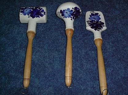 Biete in dieser Auktion an: wunderschönes altes Küche-Set mit Holzgriff, vorn mit Keramik, blau bedruckt am Griff kleiner Metallring zum Anhängen zum Gebrauch und Deko bestens Die 3 Teile sind gebraucht und wurden auch benutzt.Holz etwas stumpf durch Gebrauch und Wäsche. In der Keramikglasur kleine