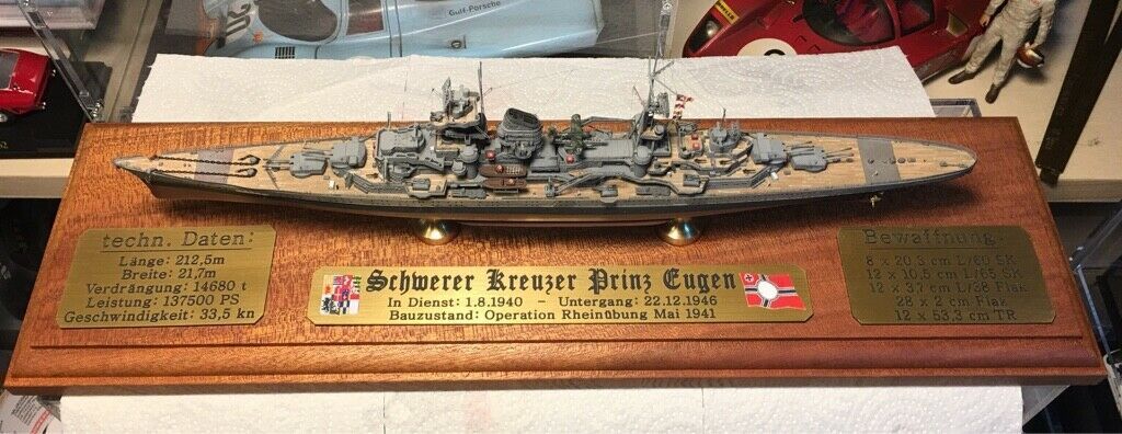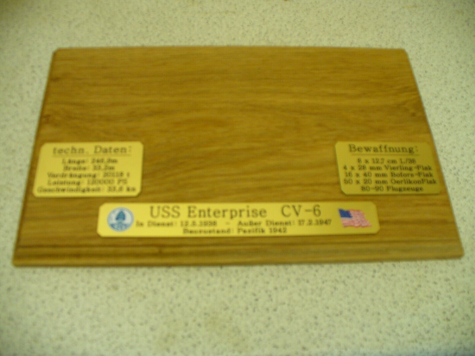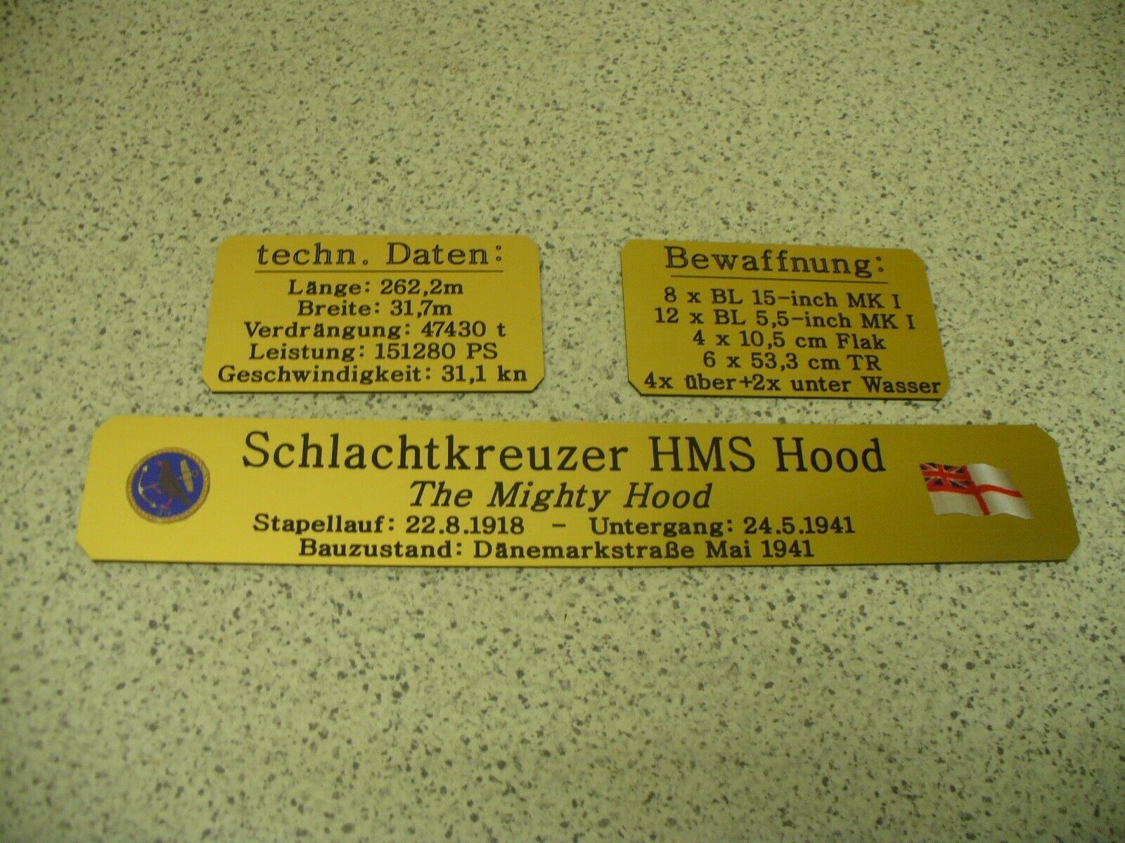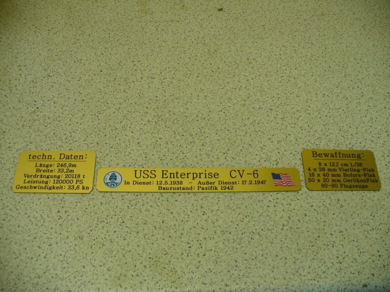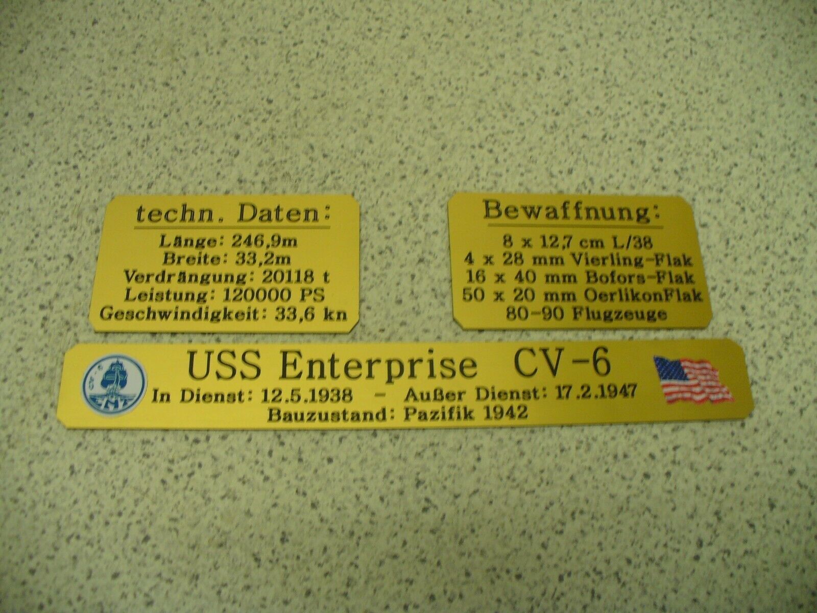 Sie bieten hier auf: 3-teiliges Namensschild mit Daten - USS Enterprise CV6 - (oder z.B. auch 'Prinz Eugen' oder 'Hood' ... - Andere Schilder gerne auf Anfrage - ) mit farbigen Logos und verschiedenen Daten (siehe Bild) goldfarbig mit schwarzem Schriftzug (auch in weiss - oder silberfarbig möglich -