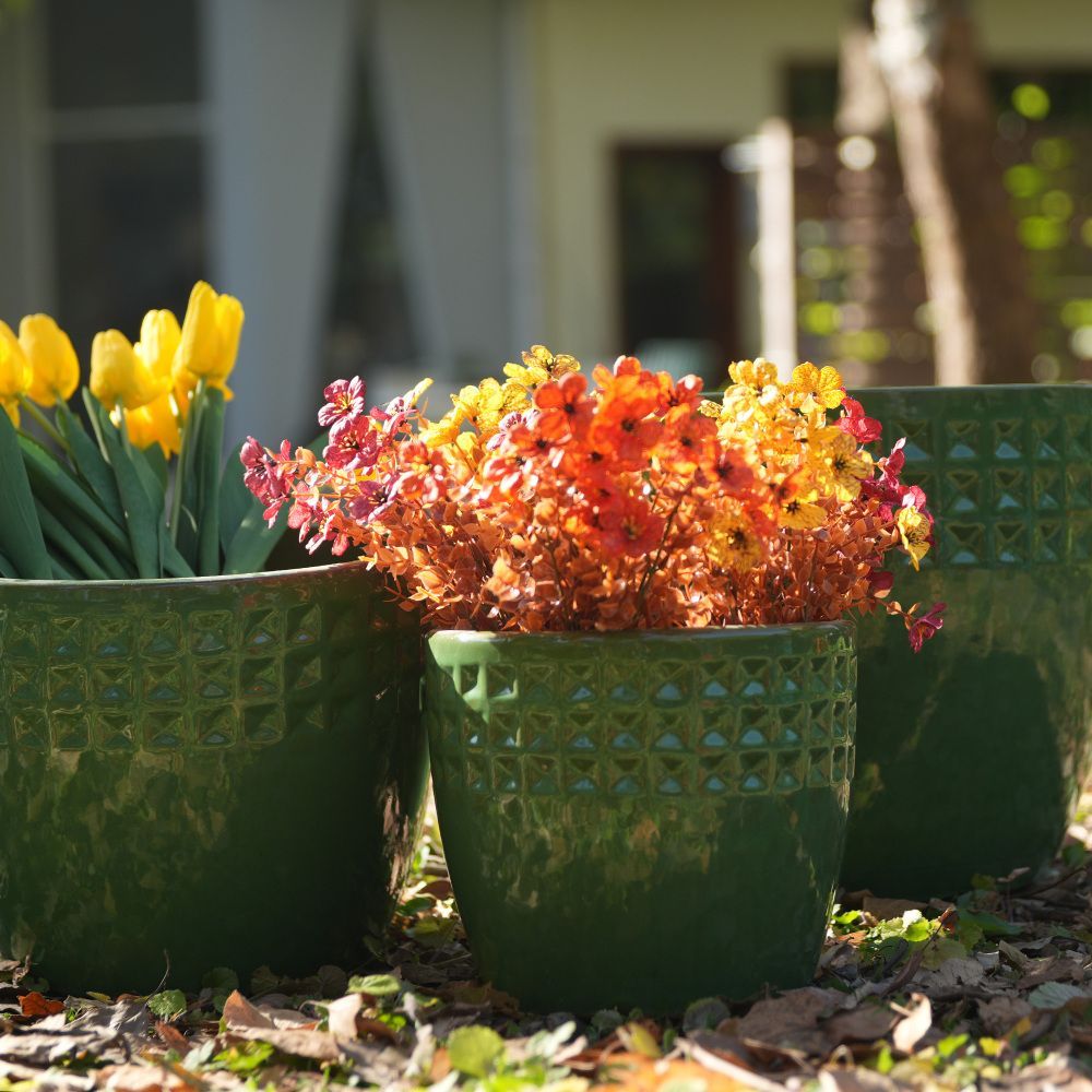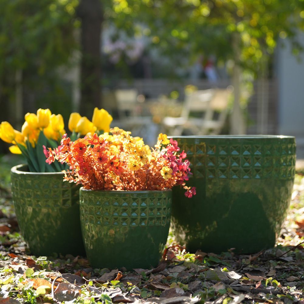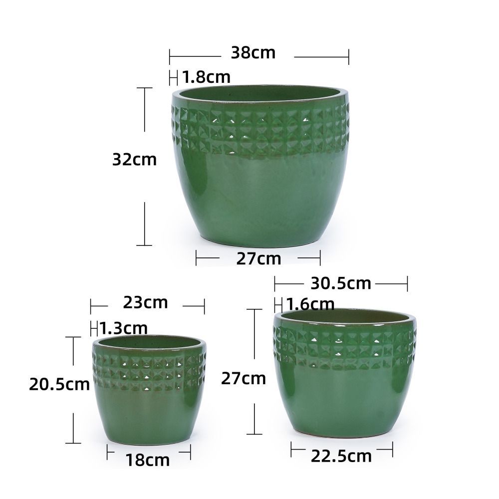 Dieses 3-teilige handgefertigte Keramik-Pflanztopf-Set verbindet dekoratives Design mit praktischer Nutzung. Das grüne Rautenmuster im Farbton Antique Light bringt einen eleganten Akzent in Wohnräume, auf Fensterbänke oder Bücherregale. Die atmungsaktive Tonware eignet sich ideal für Orchideen, Kakteen und Sukkulenten. Die Pflanztöpfe sind für den Innen- und Außenbereich geeignet und schaffen eine stilvolle Präsentation Ihrer Pflanzen.