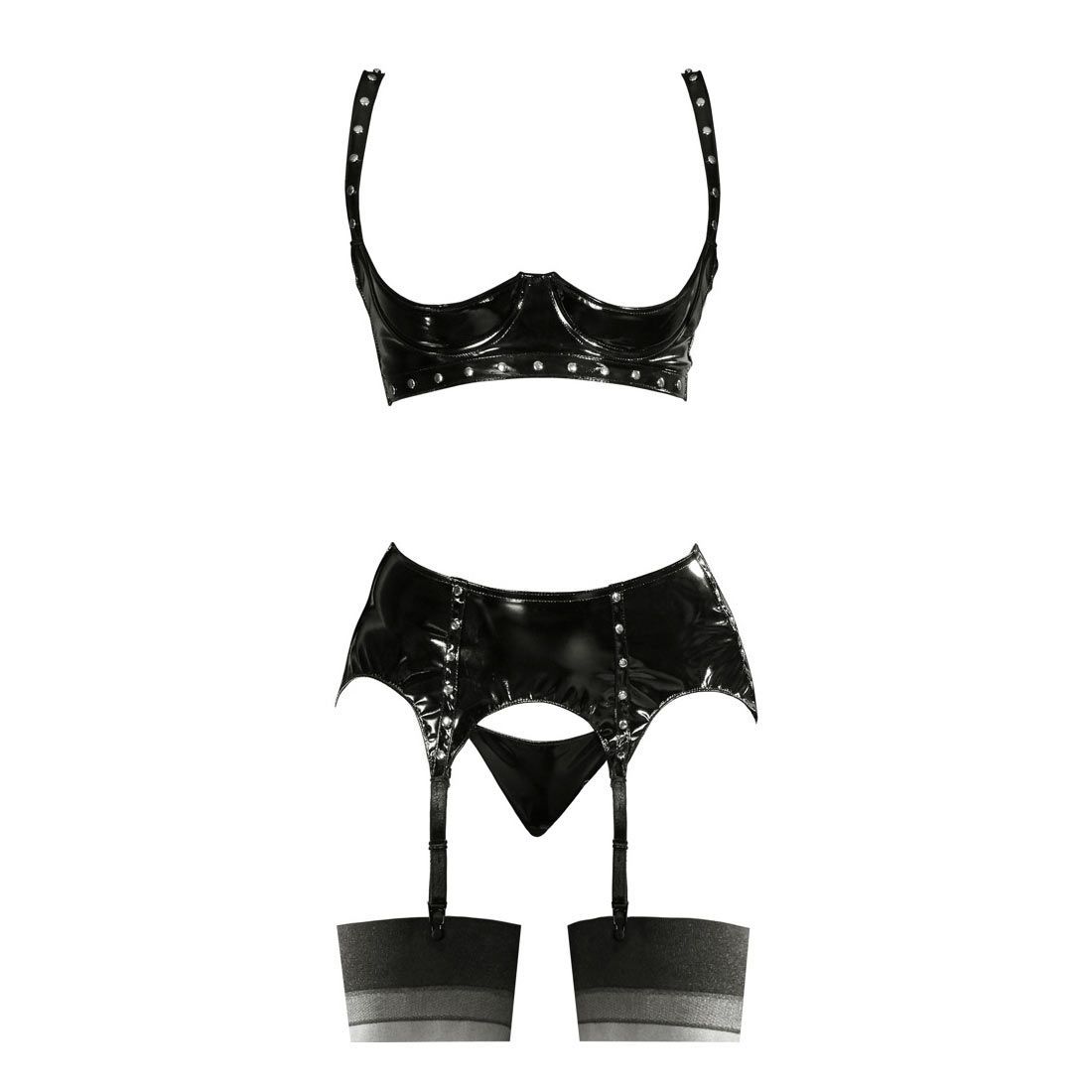 Black Level 3 tlg. Lack Hebe Straps-Set S M L XL Nieten Glanz schwarz Dessous Damen "Alexis"