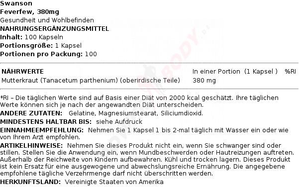 3 x Swanson Feverfew, 380mg - 100 caps