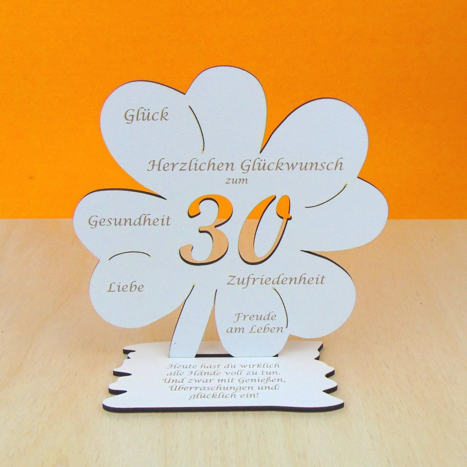 30. Geburtstag Gutscheingeschenk als Kleeblatt in 16 cm im Vintage Style, Weiß. Ein Halter auf der Rückseite dient für einen Gutschein oder ihr Geldscheine. Beidseitig in der Farbe: Vintage Weiß beschichtet mit Gravierten Text. Heute hast hast du wirklich alle Hände voll zu tun. Und zwar mit Genießen und glücklich sein! Unterplatte sind in 14 verschiedenen Sprüchen erhältlich, siehe Shop. Alle Geburtstagszahlen sind erhältlich. holzteilchen_diy