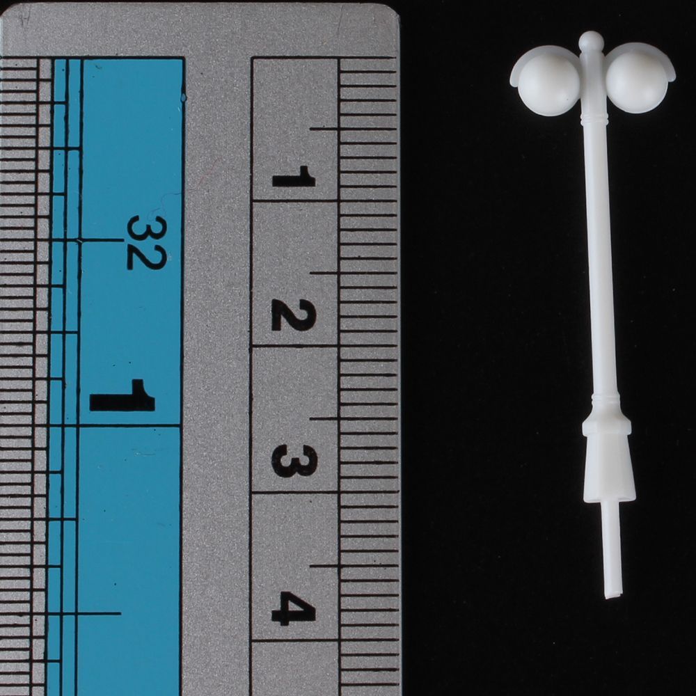 Modellbau Dioramen Zubehör in Form von doppelflammige Laternen. 30 Stück identisches Eisenbahn Spur N Dekolaternen mit einer Höhe von 32mm. Kunststoff Modellbau Laternen aus einem weißen Kunststoff Material im Modelleisenbahn 1:160 Maßstab.
