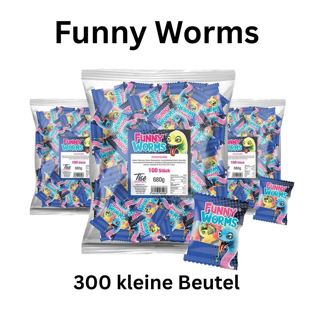 Bunte Würmer Fruchtgummi – perfekt für Events und Karneval! - 300 Funny Worms Fruchtgummi Mini Beutel einzeln verpackt Großpackung Bunte Würmer Fruchtgummi – perfekt für Events und Karneval! Ihre Vorteile 300 Mini Beutel: Einzeln verpackt mit bunten Fruchtgummi Würmern Wurmform: Lustig und fruchtig