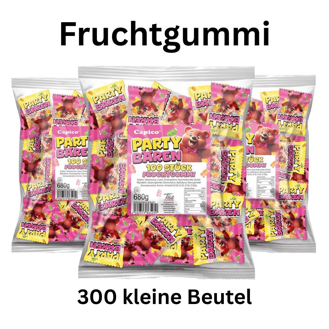 Was sind Party Bären? Fruchtgummis in Bärenform mit fruchtigem Geschmack. Eignet sich für Karneval? Ja perfekt als einzeln verpacktes Wurfmaterial Kamelle für Fasching Fastnacht. Wie viele Beutel sind enthalten? Genau 300 Stück in der Großpackung. Für welche Anlässe ideal? Partys Kindergeburtstage Firmenfeiern Messen Promotion Vereine Wiederverkauf Kiosk Einzelhandel und Großhandel.