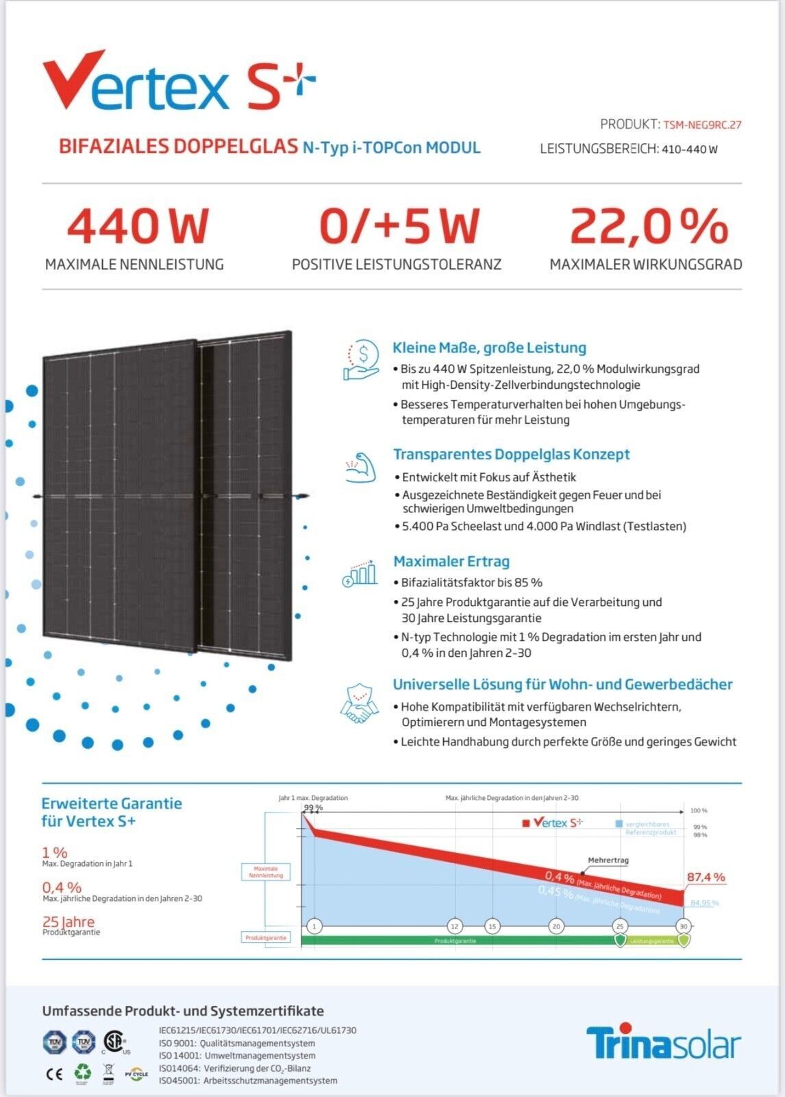 36 x Trinasolar 440W NEG9RC.27 -Solarmodul Glas-Glas Vertex S+, 440Wp full black Trina Solar ist ein weltweit führender und namhafter Hersteller aus dem Bereich der Photovoltaik. Er ist bekannt für seine hochwertigen Solar-Module. Seit seiner Gründung im Jahr 1997 konnte sich das Unternehmen einen g