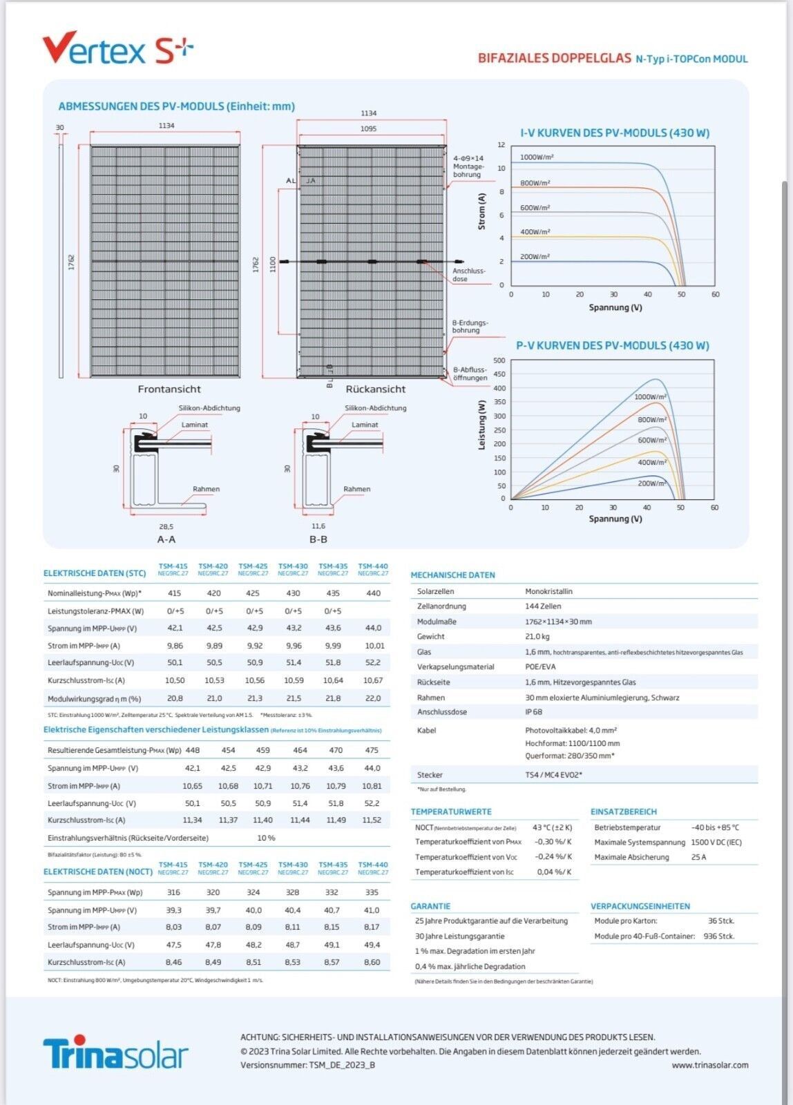 36x TRINA VERTEX S+ Trina NEG9RC.27 Photovoltaik Solar PV Modul 440W Bifacial