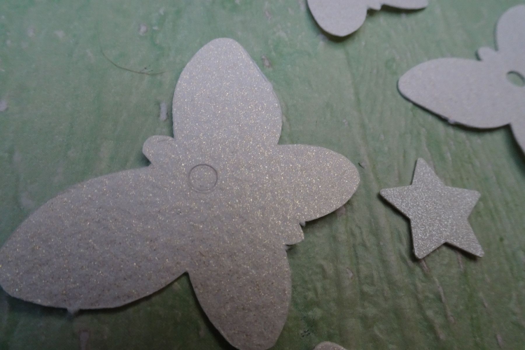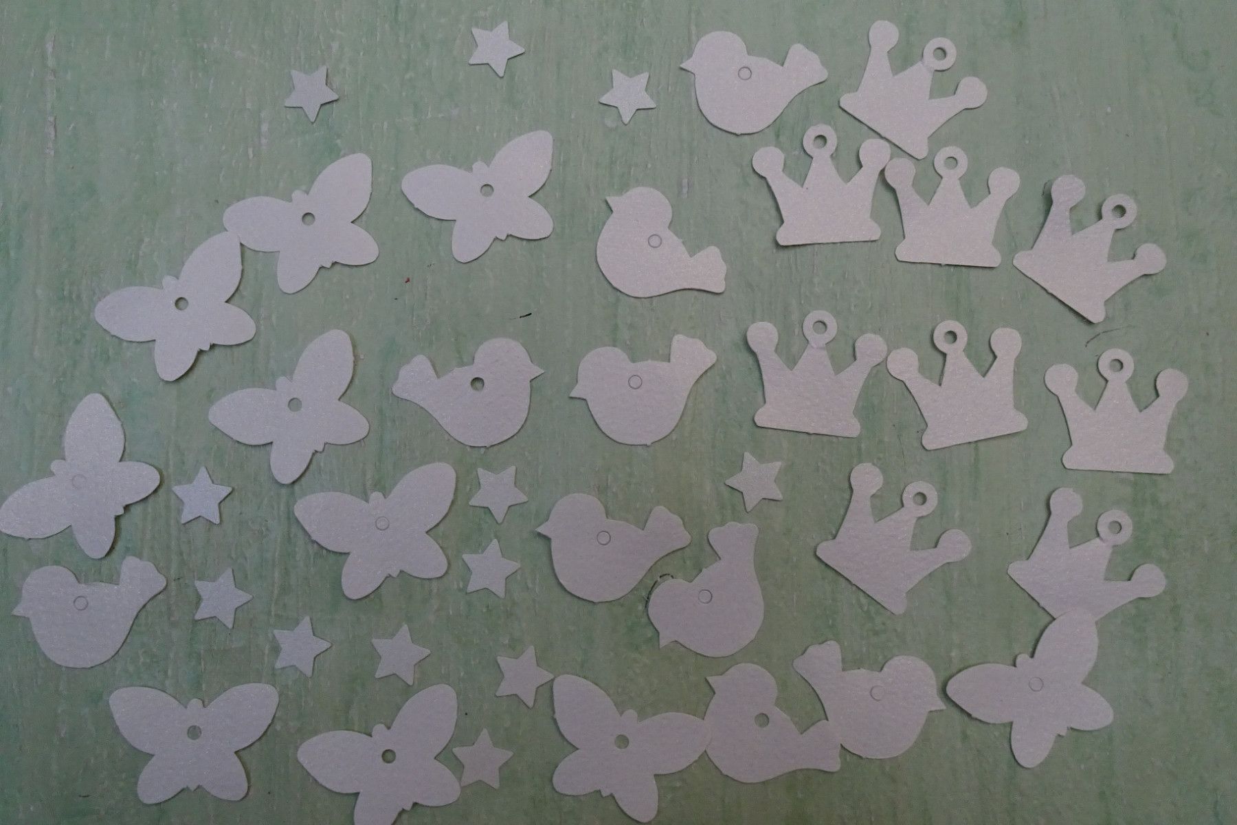 38 perlmutt creme Karton Stanzteile Krone Vogel Schmetterling Sterne ca 3cm