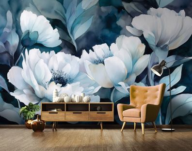 Vlies Fototapete Blumen Weiß Blau TAPETE XXL Wohnzimmer Schlafzimmer