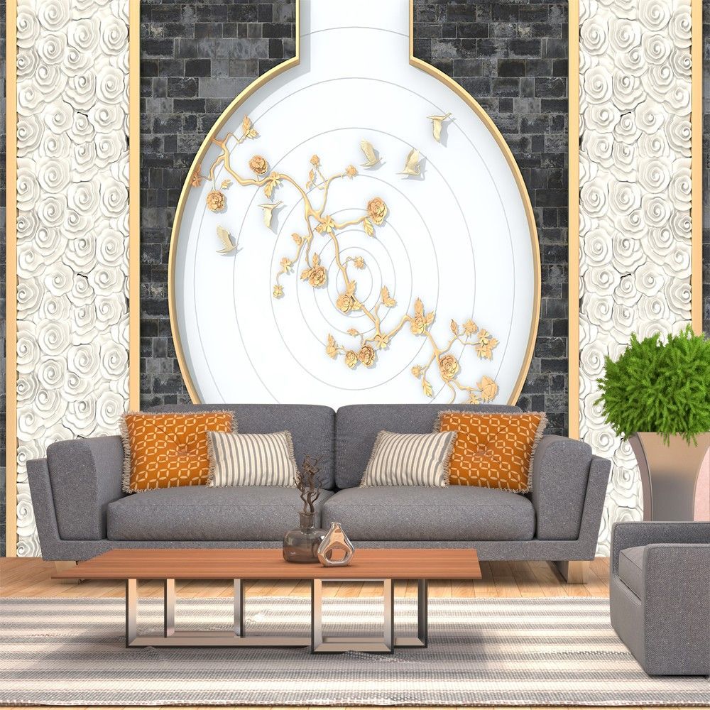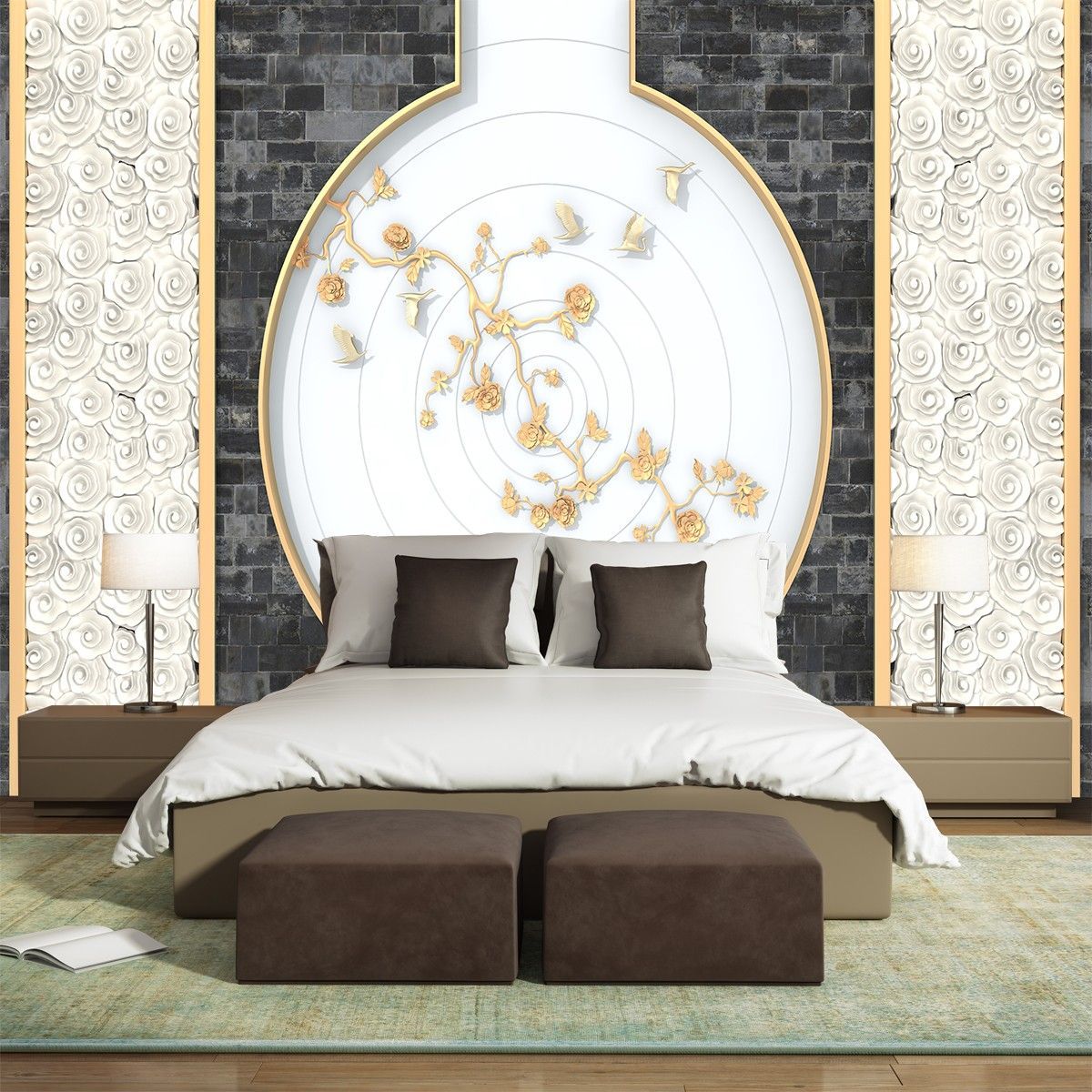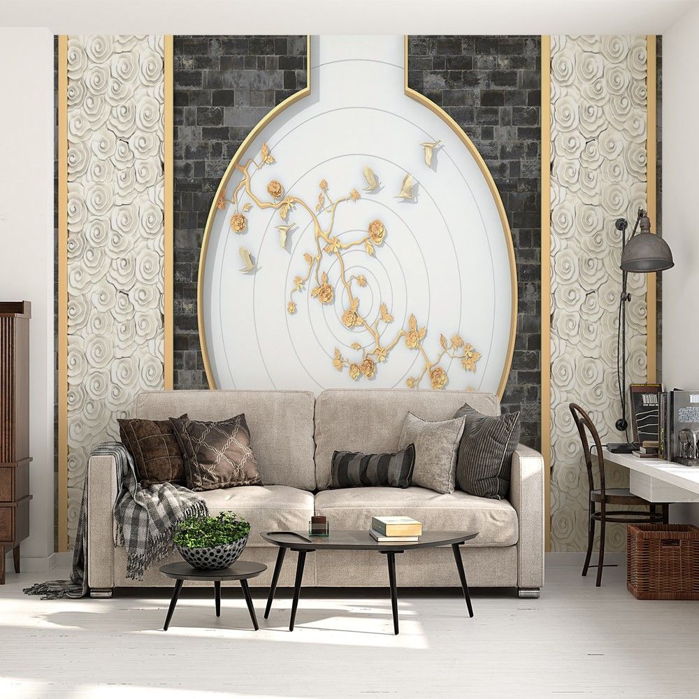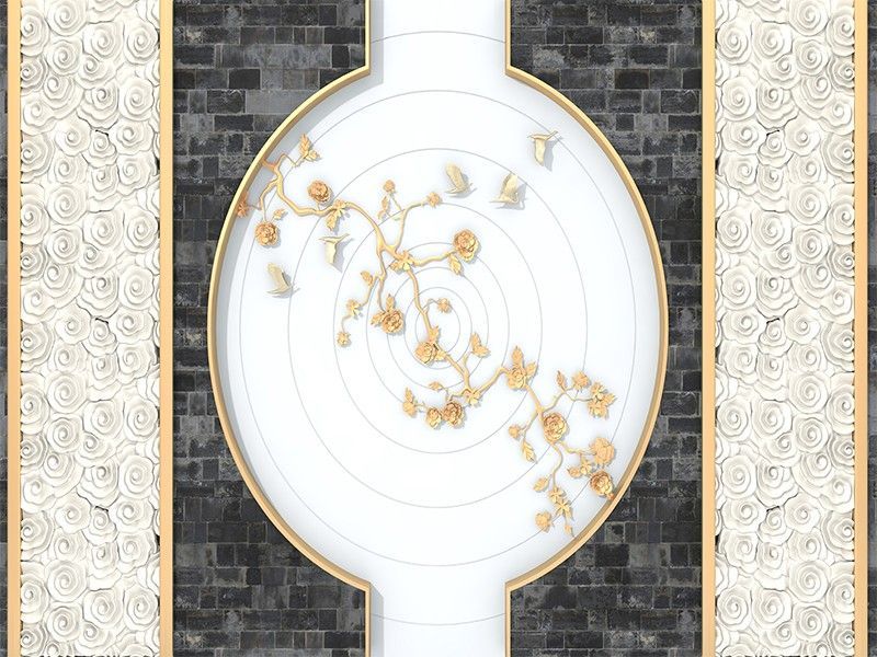 3D Fototapete Stil Gold Blumen Vögel Grau Ziegel Goldene Blumen Vögel 7420