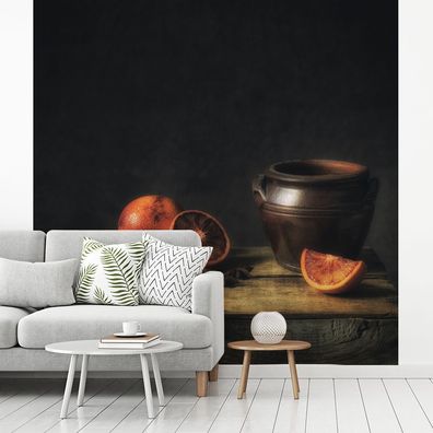 • Fototapete - 350x350 cm - Gemälde - Stilleben - Vase - Tisch - Orange - Kunst