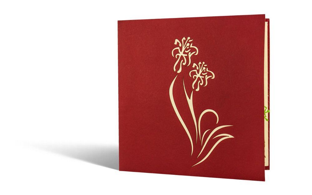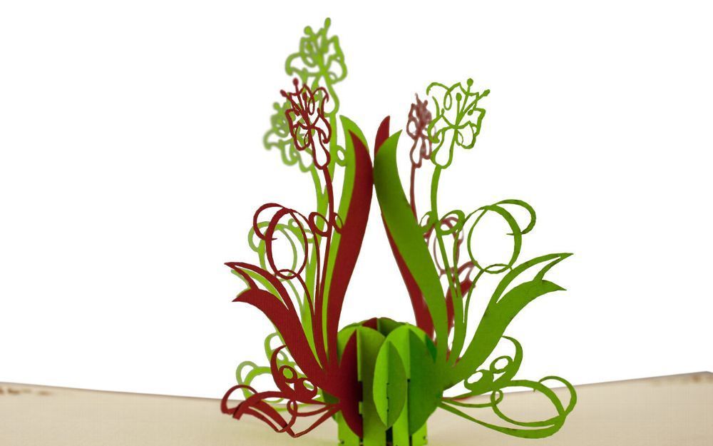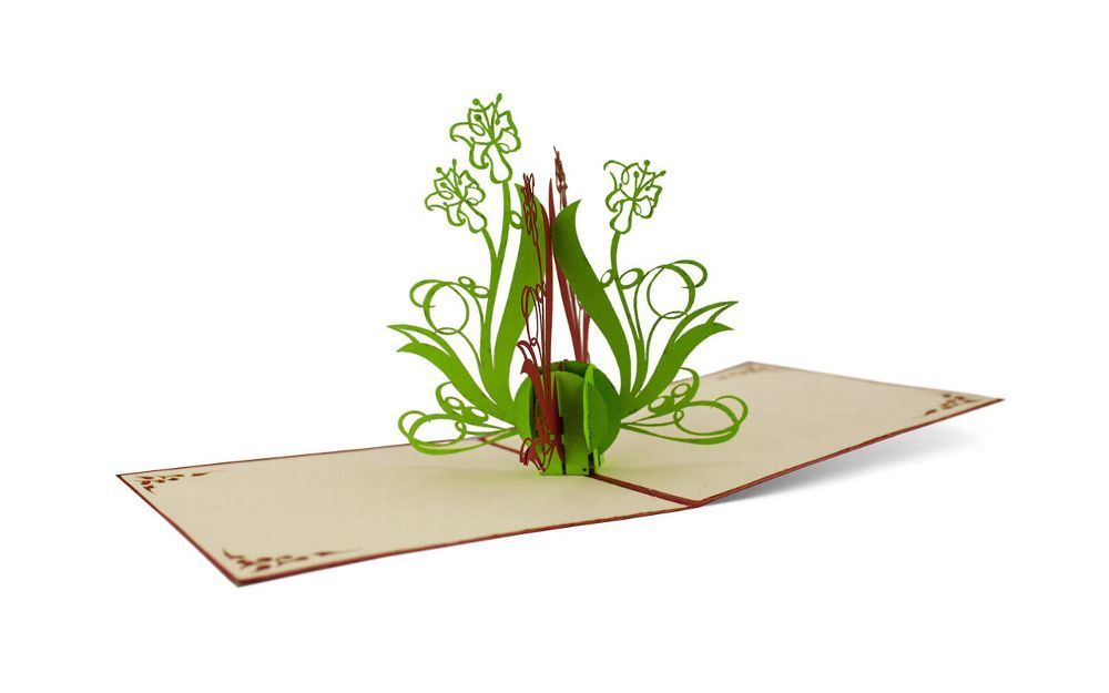 3D Klappkarte Schwertlilien Schwertlilien sind eine Freude für jede Frau. Leider sind diese einzigartigen Pflanzen sehr vergänglich. Umgehen Sie das Problem und verschenken Sie die Schwertlilien aus Papier - sie halten ewig und verwelken nie. Diese Klappkarte ist wunderbar geeignet für Gutscheine od