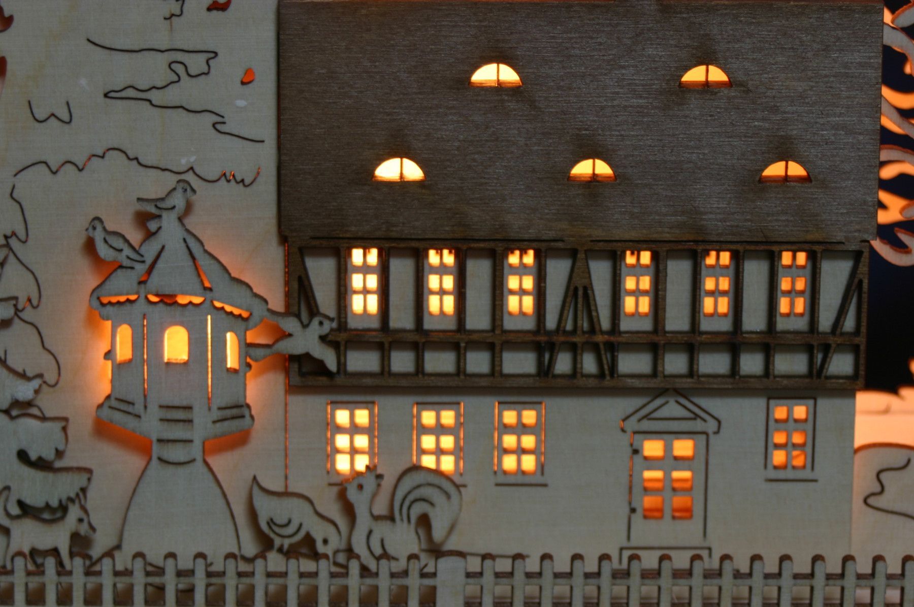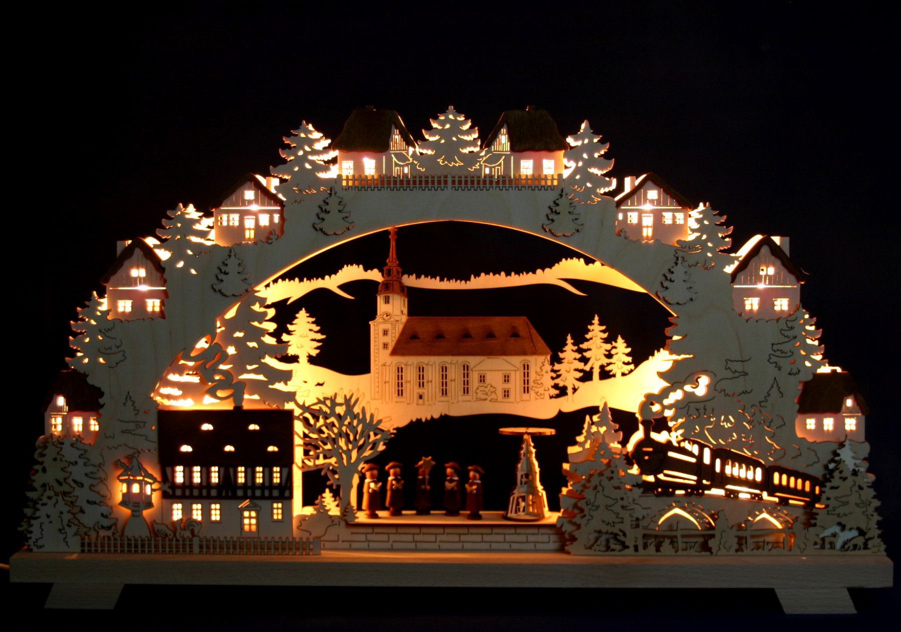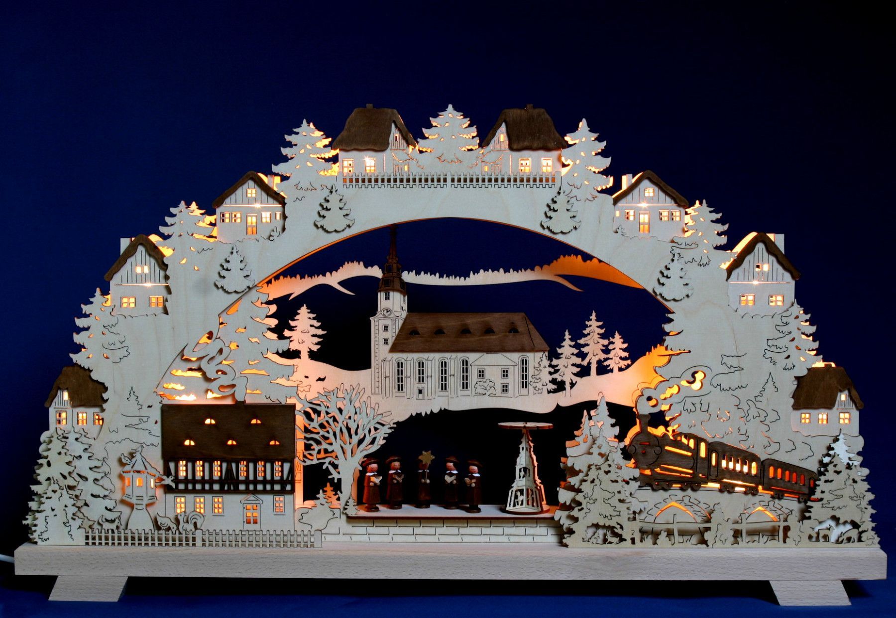3D-Schwibbogen 68x39cm Weihnachtsdorf mit Zug Eisenbahn Lok Erzgebirge Holz