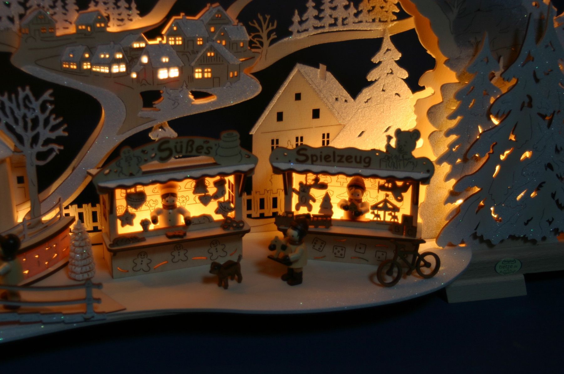 Exclusiver großer 3D-Schwibbogen mit innenbeleuchteter Holzkirche und 2 Marktbuden, verschneit... +GRATIS - Aufsteckbäumchen zur komplett indirekten Beleuchtung - bei uns inklusive! Größe (B x H x T): 72 x 41 x 7 cm - ab eigenem Lager lieferbar - hergestellt im Erzgebirge dezent mit Kunstschnee abge