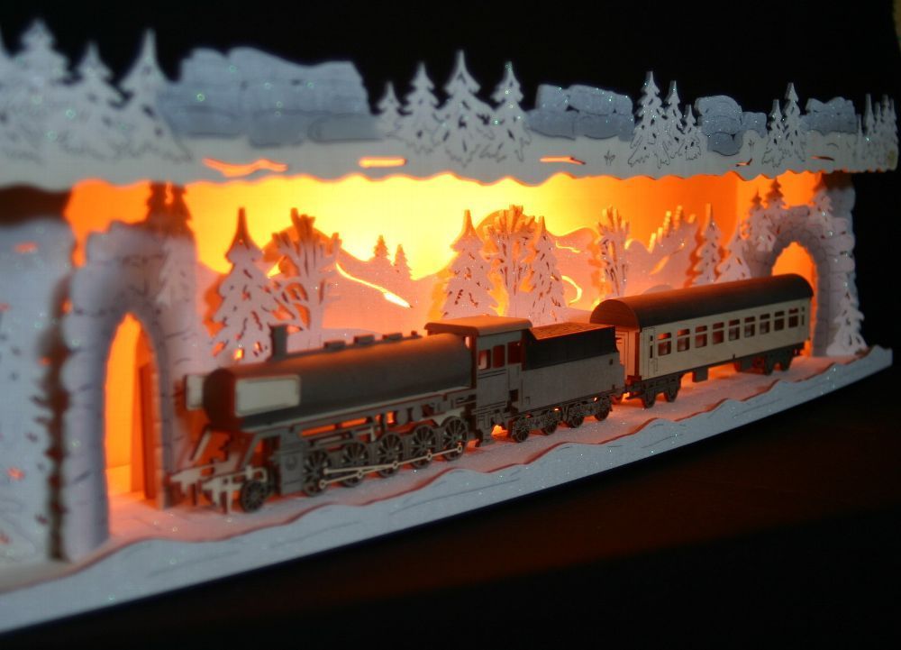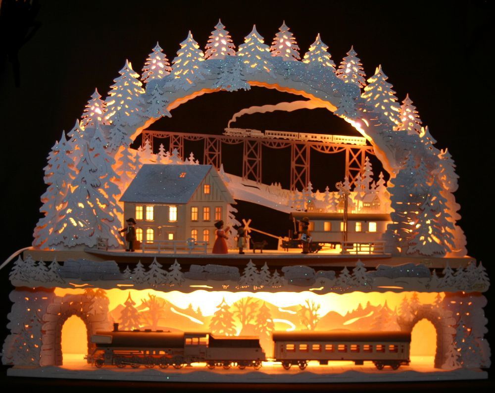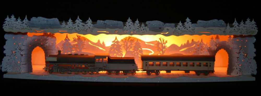 3D-Schwibbogen-Erhöhung Sockel 76cm Eisenbahn im Winter Lok Dampflok Zug Erzgebirge