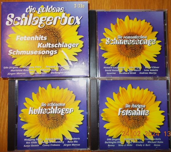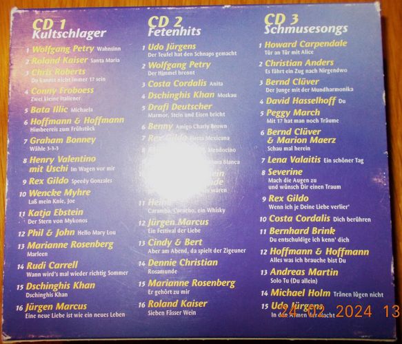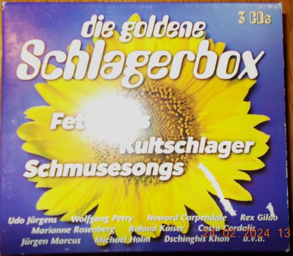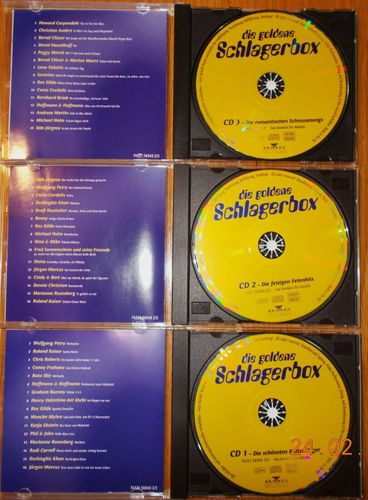 Sie bieten auf die 3er-CD-Box Die Goldene Schlagerbox . Mit einem Startpreis von 1 €uro für diese drei CDs ein echtes Schnäppchen! Und: sparen Sie Versandkosten, indem Sie noch weitere CDs von mir ersteigern! Trackliste CD 1, Die Schönsten Kultschlager 1-1 Wolfgang Petry – Wahnsinn 1-2 Ro