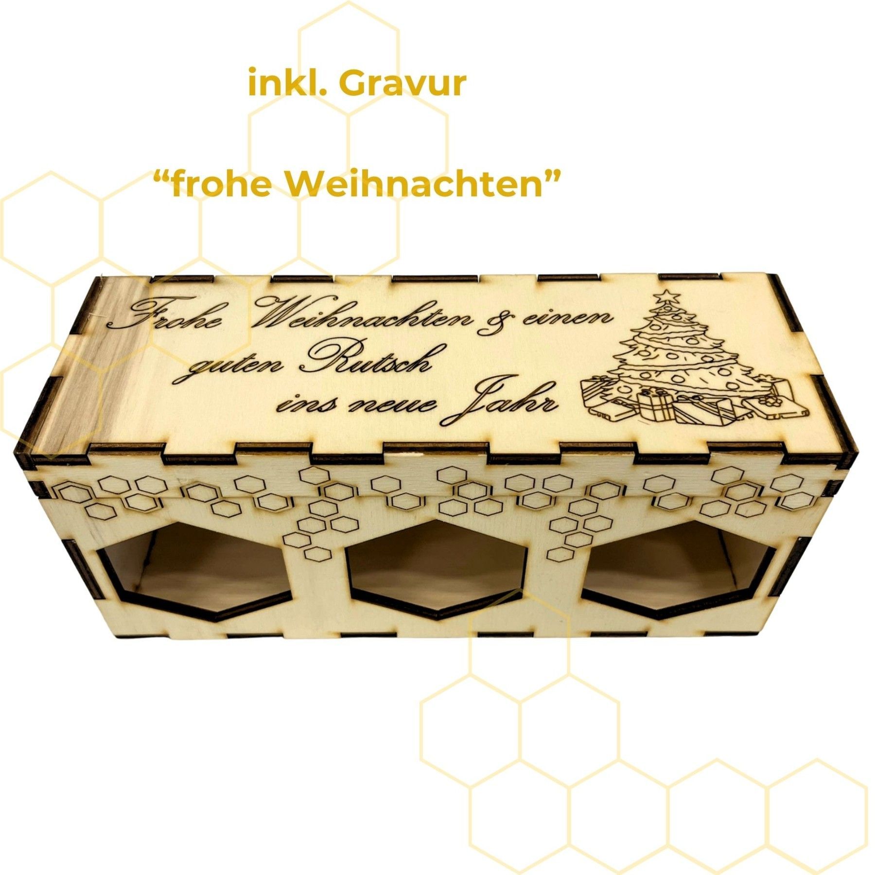 3er Holzgeschenkset mit 250g Honiggläsern in 3 Sorten inkl. Gravur "Weihnachten"