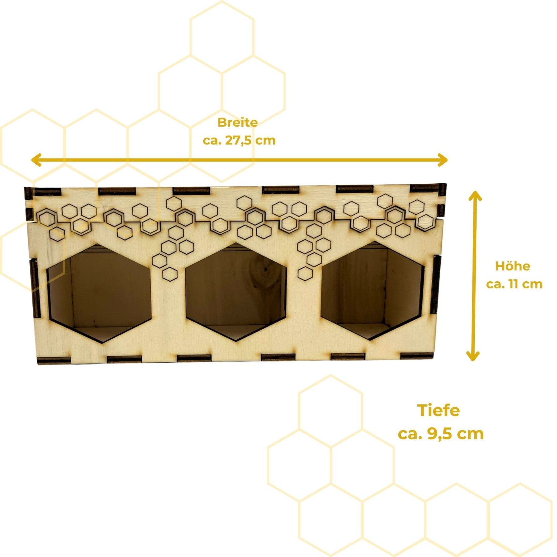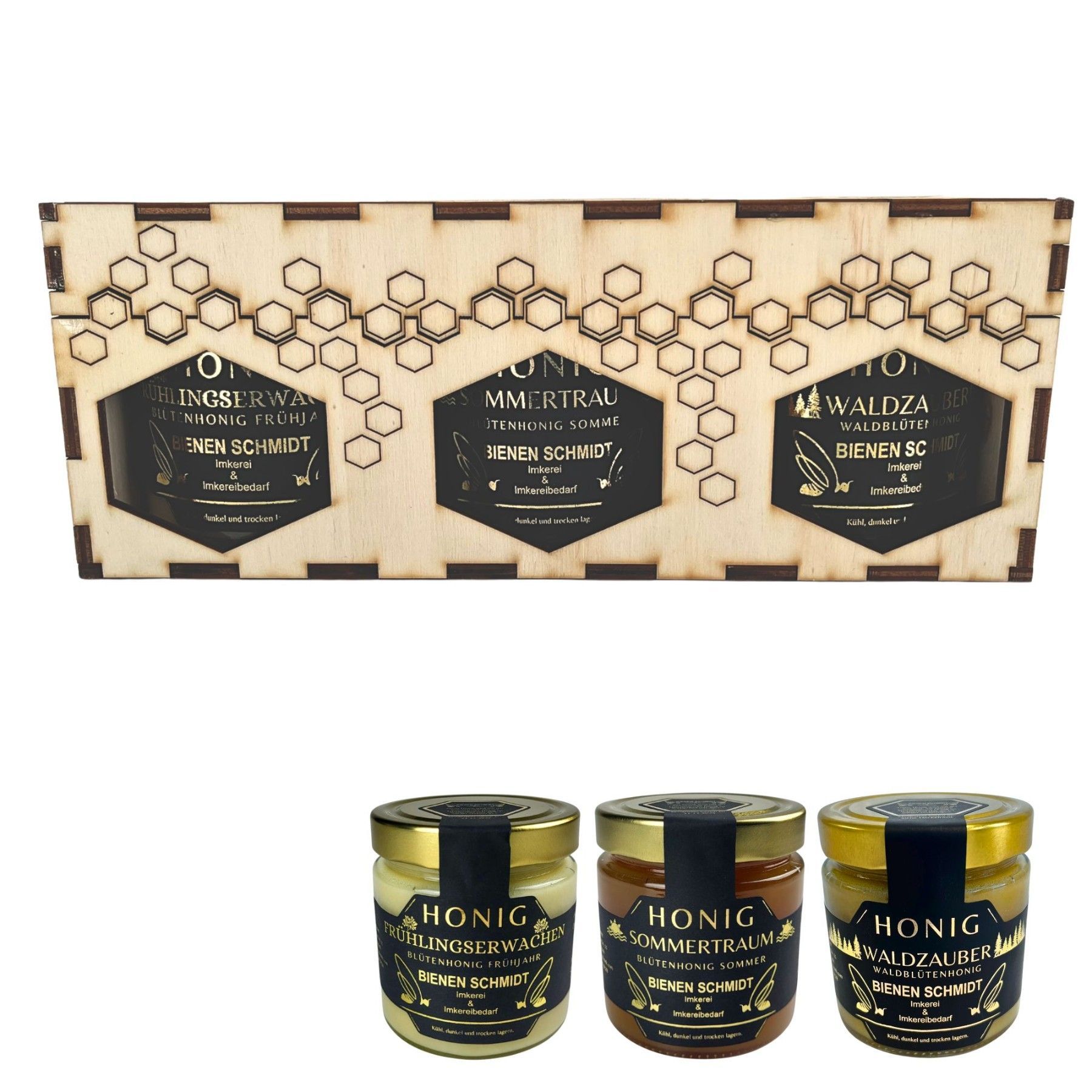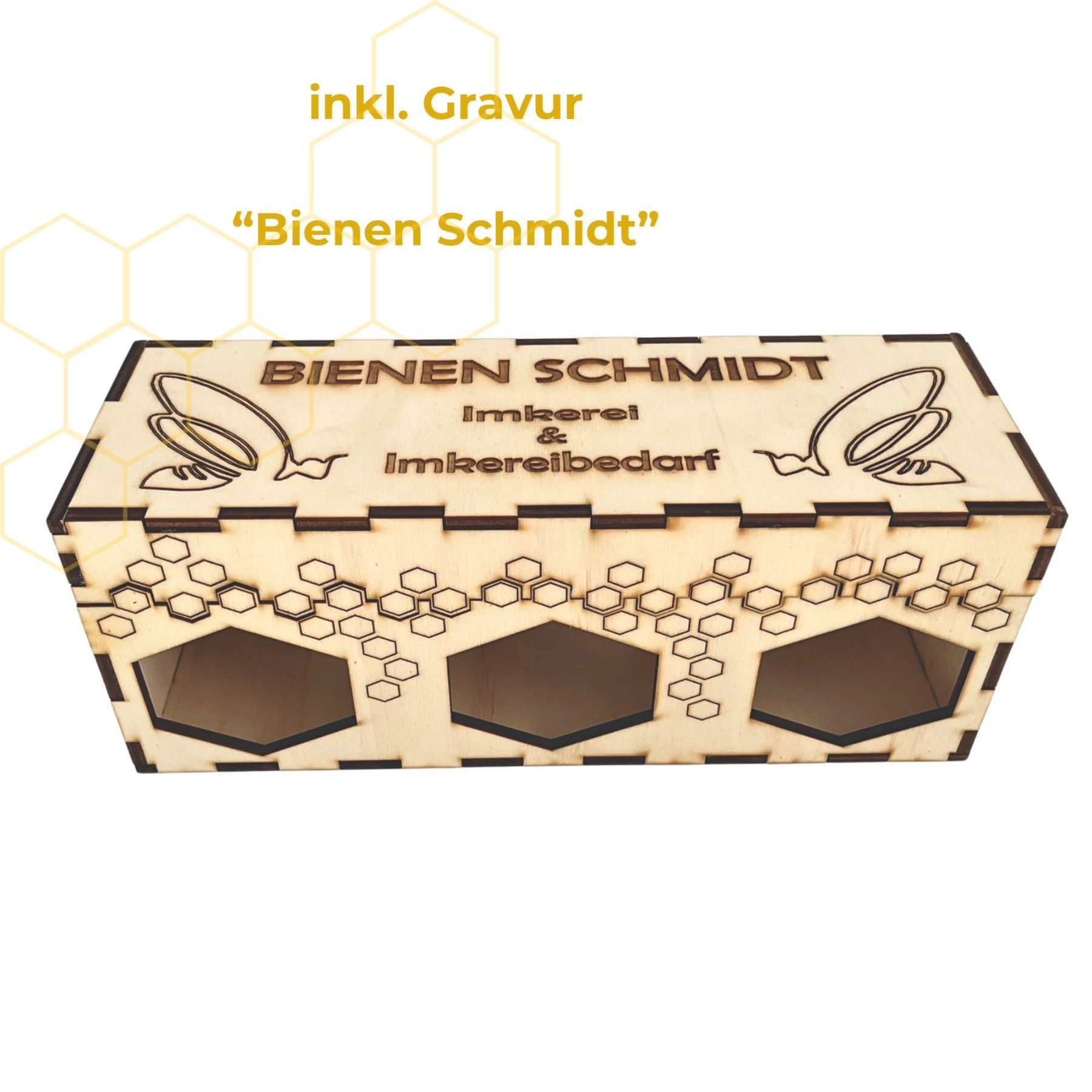 3er Holzgeschenkset mit 500g Honiggläsern in 3 Sorten inkl. Gravur "BIENEN"