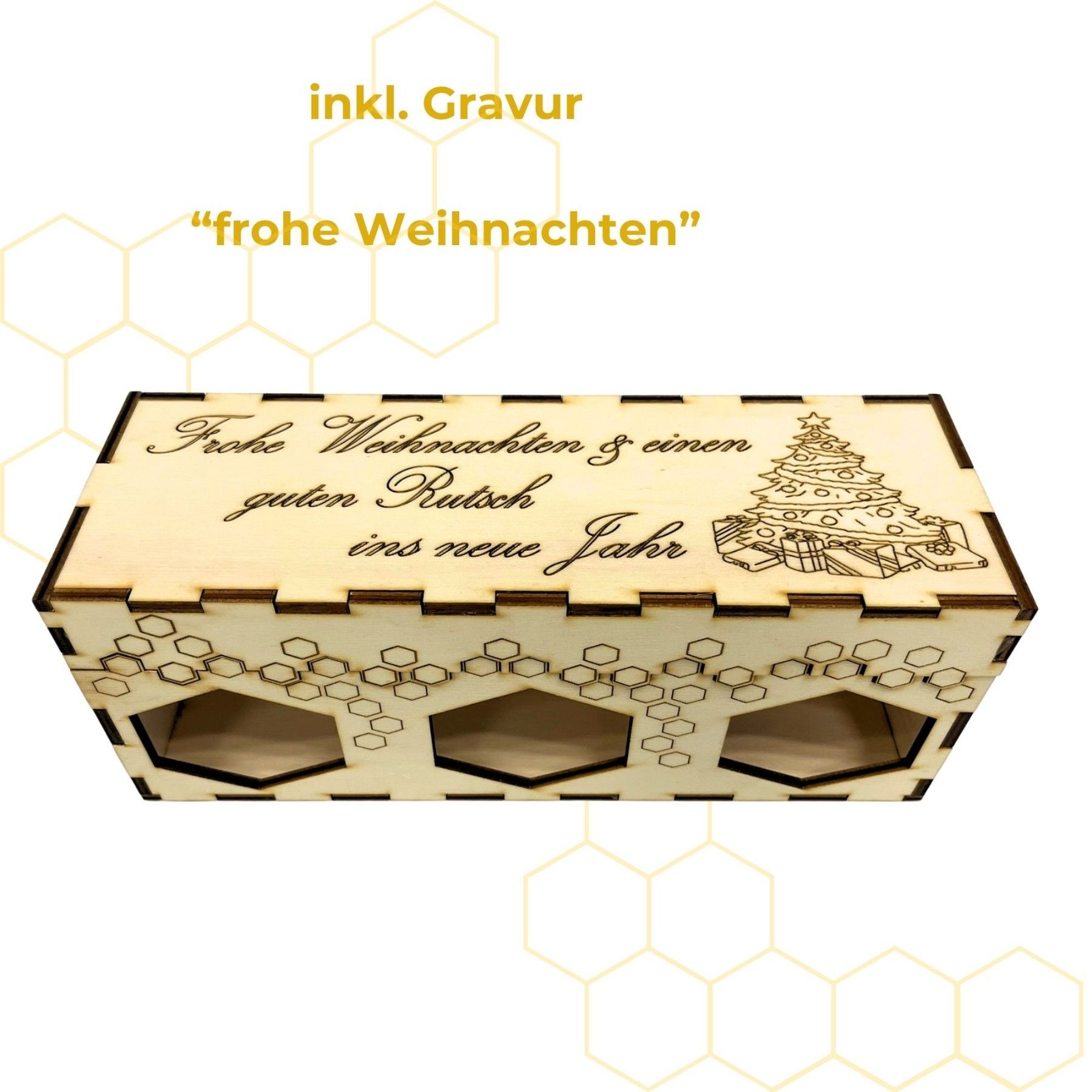 3er Holzgeschenkset mit 500g Honiggläsern in 3 Sorten inkl. Gravur "Weihnachten"