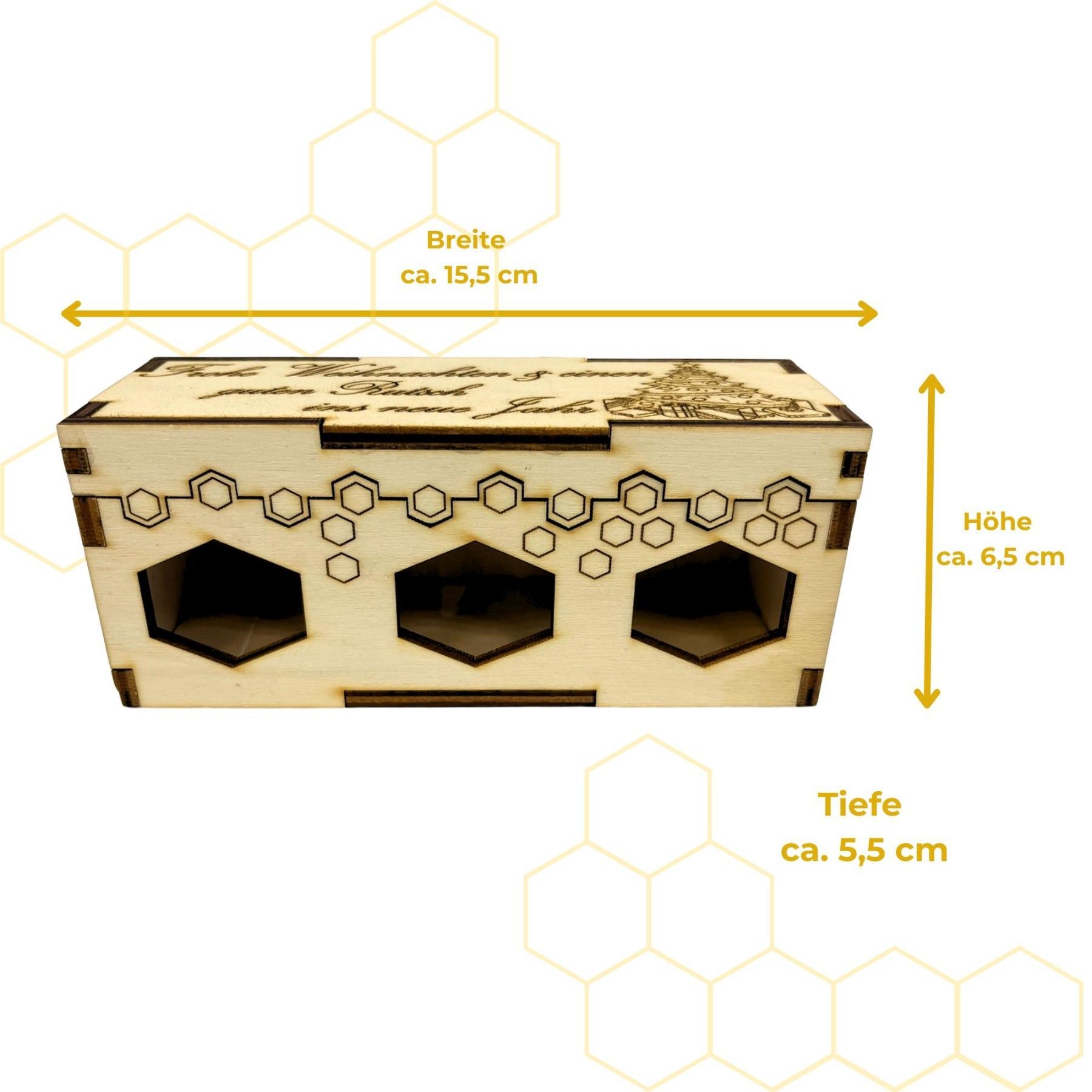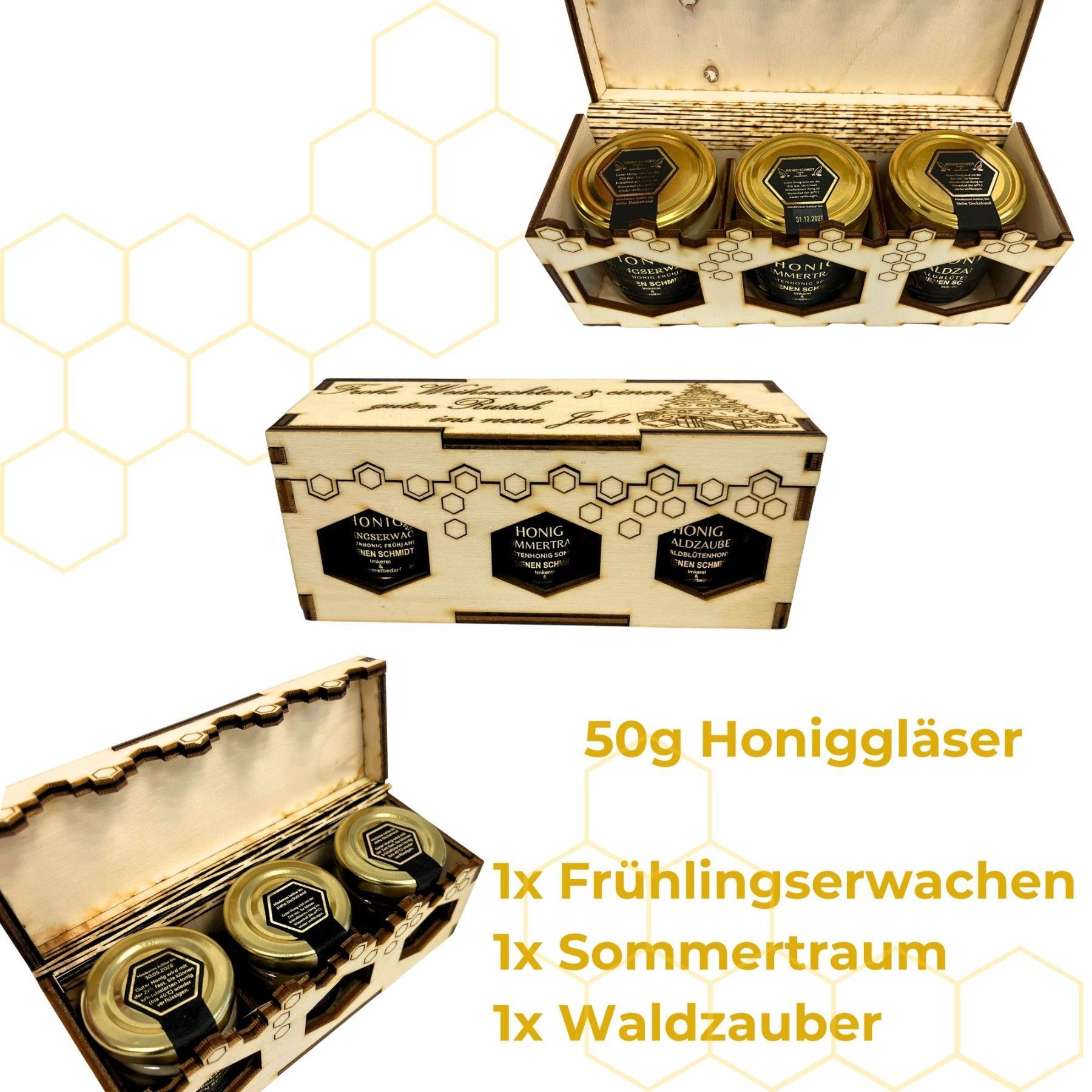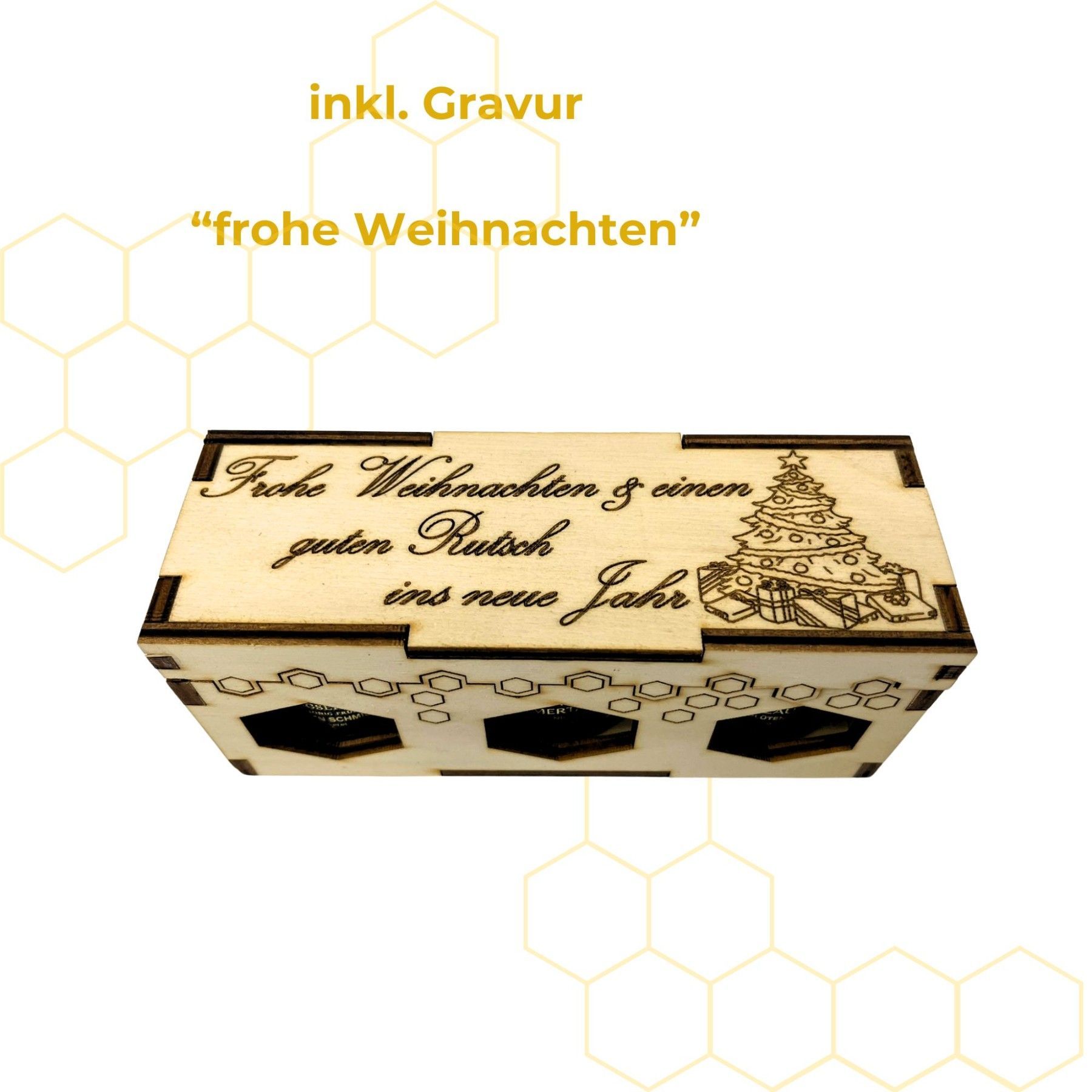 3er Holzgeschenkset mit 50g Honiggläsern in 3 Sorten inkl. Gravur "Weihnachten"