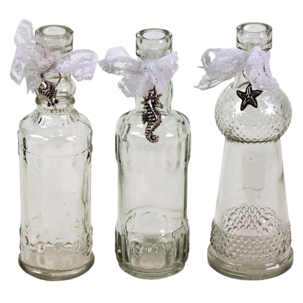 3er Satz Glas Flaschen Vasen maritim H=17 cm silber Anhänger Deko Spitzenband