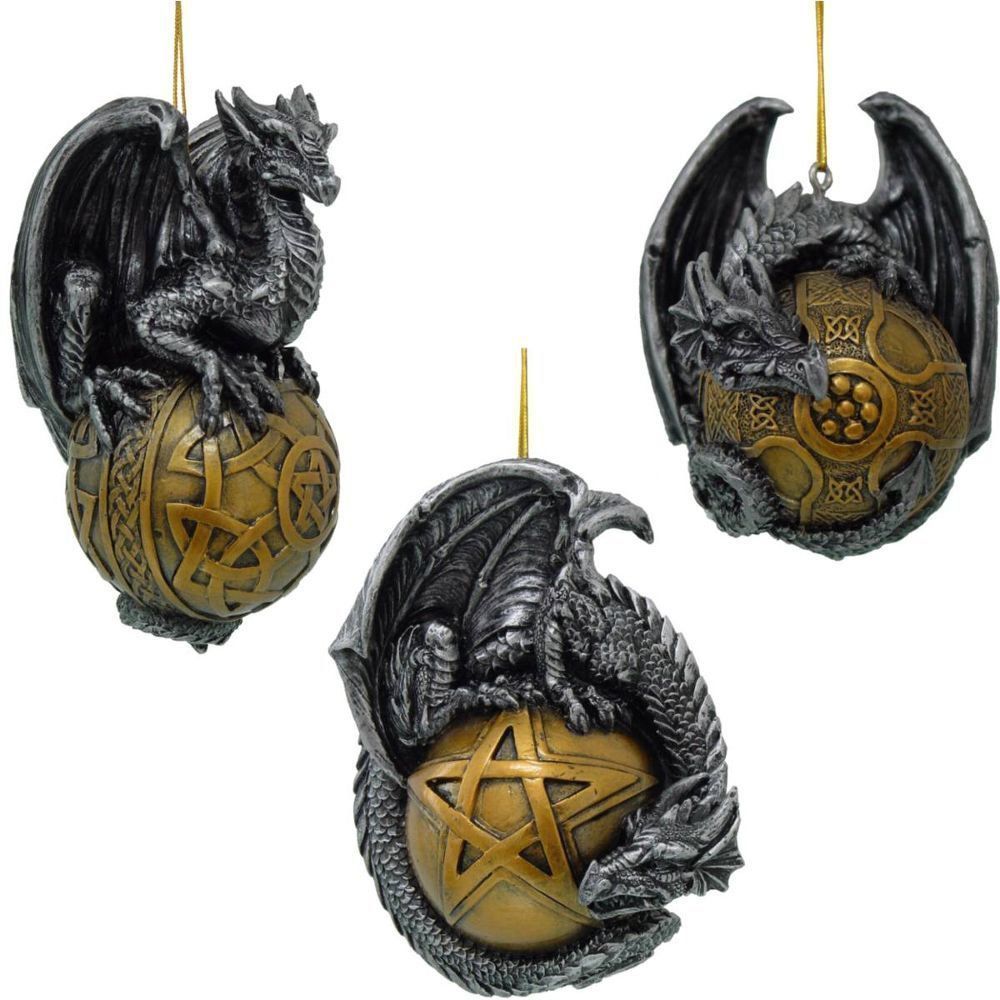 3er-Set Drachen-Christbaumkugeln, Drachen mit keltischen Kugeln (Gr. 10cm)