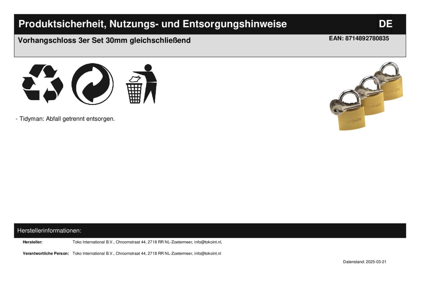 3er Set Vorhängeschlösser 30mm gleichschließend 18 Schlüssel Vorhangschloss