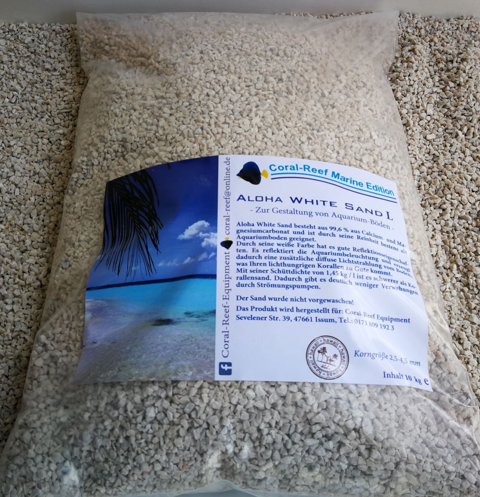 3x Coral Reef Aloha White Sand L 2,5-4,5mm - 10kg Artikelbeschreibung: Aloha White Sand Größe L 2,5-4,5mm schneeweißer Bodengrund für Ihr Aquarium Aloha White Sand besteht aus 99,6 % Calcium- und Magnesiumcarbonat und ist durch seine Reinheit bestens als Aquariumboden geeignet. Durch seine weiße Far