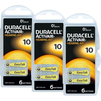 • 3x Duracell 10 Hörgerätebatterien Batterien Knopfzellen 1,45V Activair 6er Blister