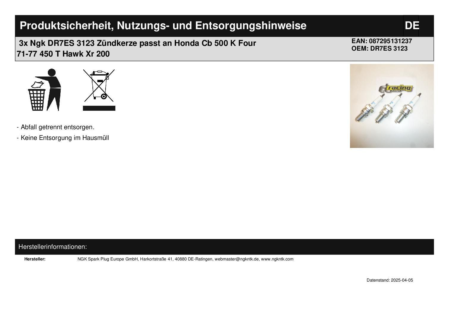 NGK 3x Ngk DR7ES 3123 Z?ndkerze passt an Honda Cb 500 K Four 71-77 450 T Hawk Xr 200
