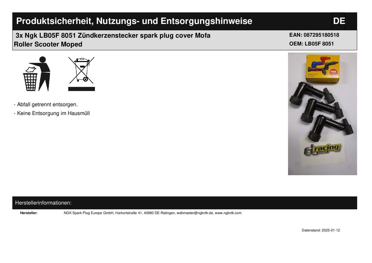 NGK 3x Ngk LB05F 8051 Zündkerzenstecker spark plug cover Mofa Roller Scooter Moped