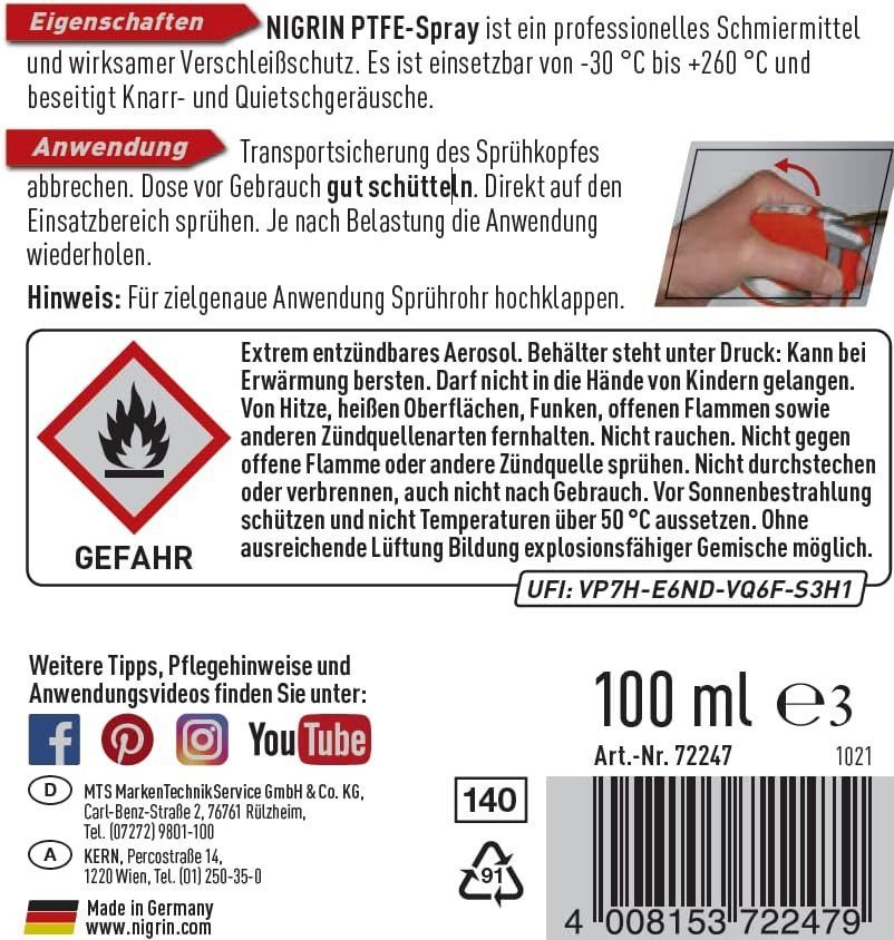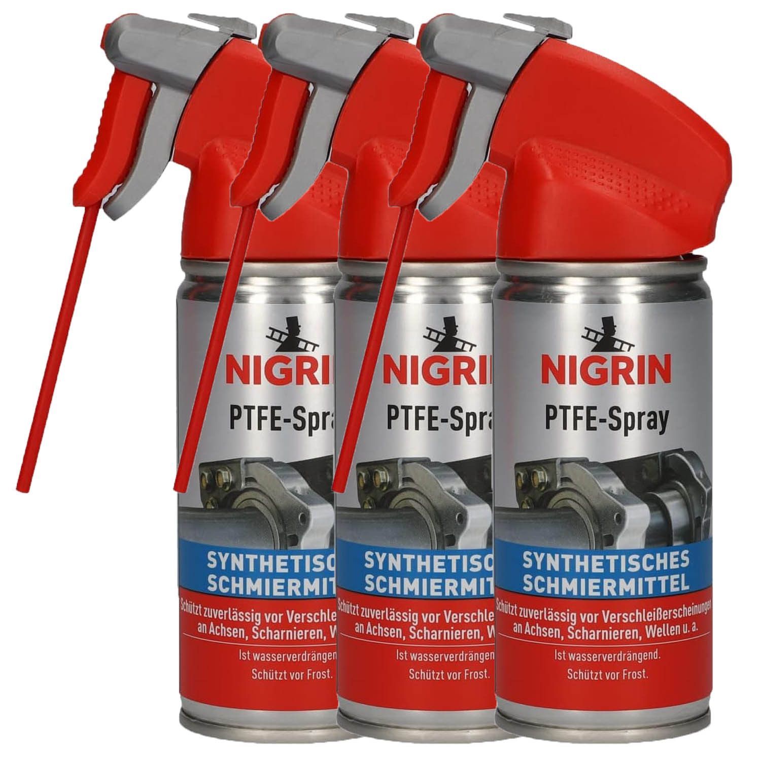 Nigrin 3x NIGRIN PTFE Spray synthetisches Schmiermittel wasserverdrängend 100ml