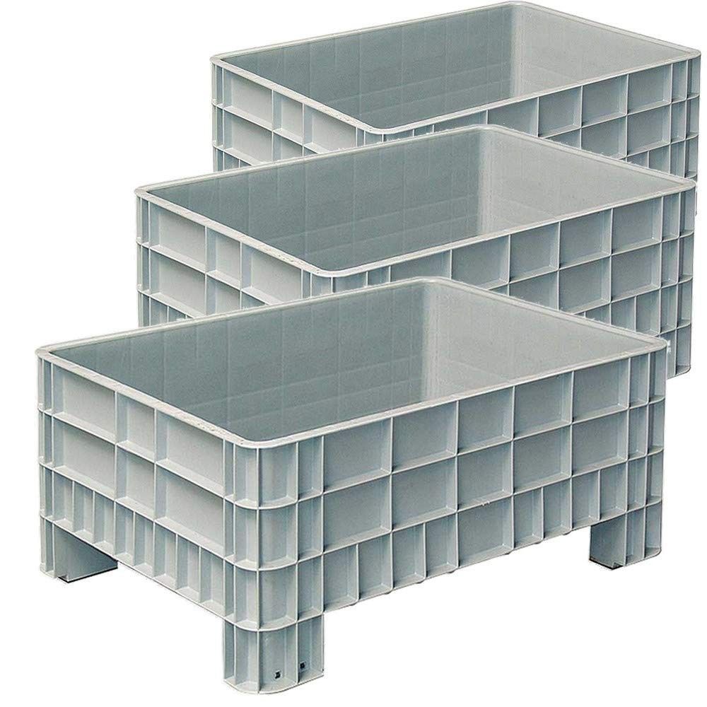 3x Palettenbox mit Außenrippen u. 4 Füßen, Außenmaße LxBxH 1170x800x520 mm, grau