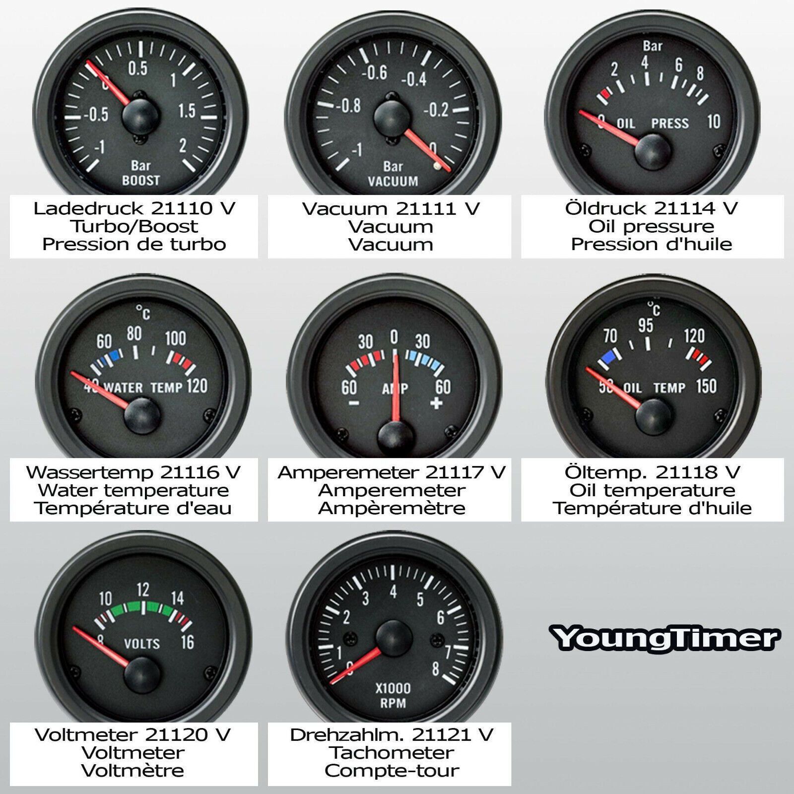 Artikelbezeichnung 3x Stück Youngtimer Design Optik 1x Wassertemperatur Anzeige 1x Öltemperatur Anzeige 1x Ladedruck Turbo Anzeige 3er Set im Vintage Look - Wassertemperatur Bereich geht von 40 - 120 Grad - Öltemperatur bis von 50 - 150 Grad - Ladedruck Bereich geht von -1 Bar Unterdruck - 2 Bar Dru