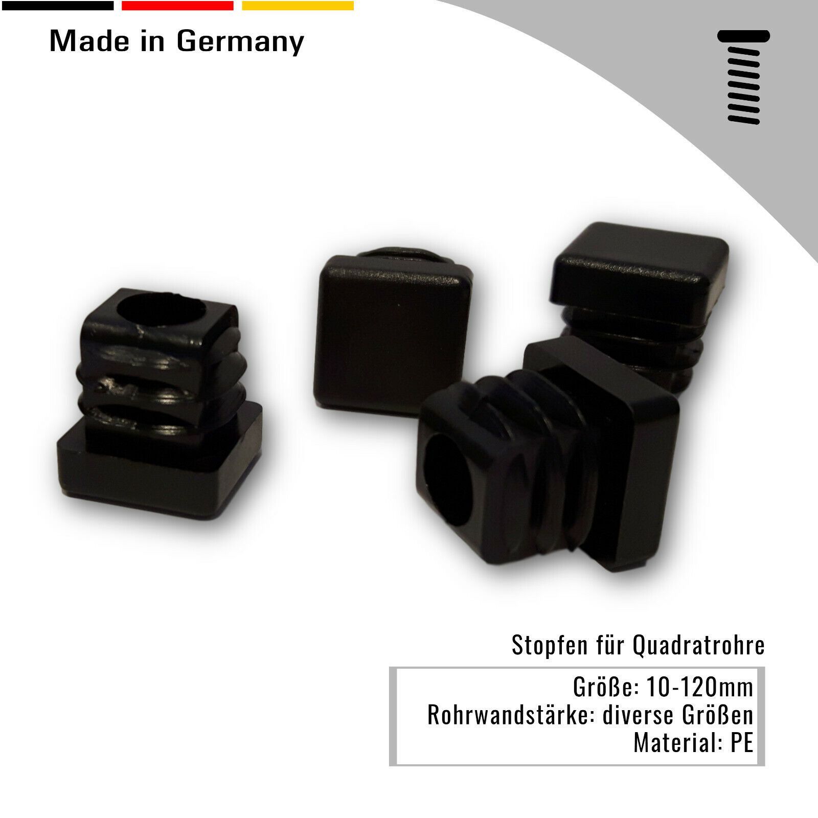 4 Lamellenstopfen aus Kunststoff für Quadratrohre Diese Lamellenstopfen werden aus dem widerstandsfähigem Kunststoff Polyethylen (PE) hergestellt. Dieser Kunststoff besitzt eine geringe Gleitreibung, weist eine hohe Zähigkeit auf und ist gut beständig gegen Chemikalien. Dank dieser Eigenschaften kön